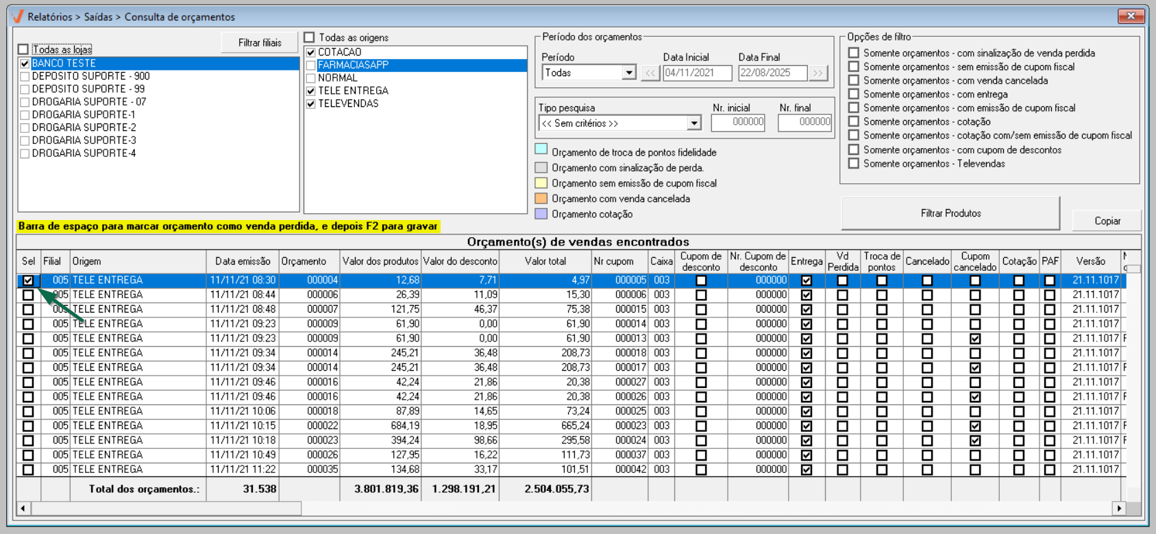 Após realizar a consulta dos orçamentos, conforme demonstrado no primeiro passo, o usuário tem a possibilidade de indicar quais orçamentos foram gerados e por algum motivo não foram convertidos em venda, encontrando-se pendentes. Neste caso, é possível alterar o seu status para "Venda perdida". Para isso, localize o orçamento desejado, selecione-o e pressione a tecla de >> Espaço, para que o registro seja marcado. A seguir, para gravar a operação, tecle o atalho F2 e confirme a operação.