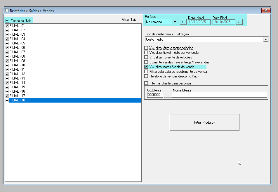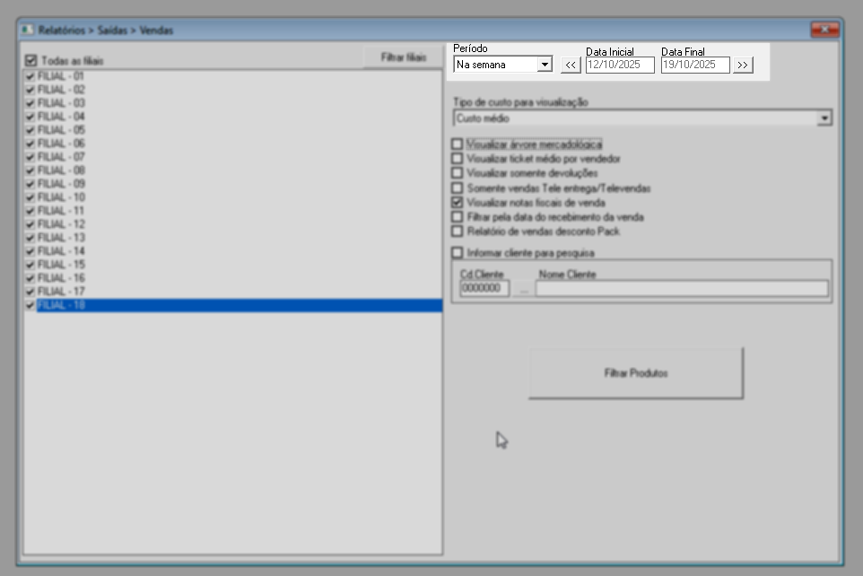 Observe que por padrão o sistema sugere a seleção de todas as filiais, mas para selecionar apenas as lojas de interesse, desmarque a opção “Todas as filiais” e marque as filiais que reputar necessárias. Além disso, o sistema disponibiliza o botão "Filtrar Filiais" a fim de que o usuário identifique as filiais através do seu grupo econômico, ao clicar sobre ele uma tela de busca será carregada, confira os detalhes desta tela de pesquisa ao clicar aqui.