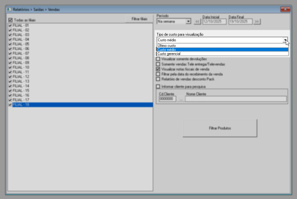 Pode-se alterar o "Período" das vendas para a referência da consulta, para isso selecione o tipo de período e conforme o parâmetro escolhido informe uma data inicial e final. Confira como utilizar o filtro por período, clique aqui e leia nosso artigo.