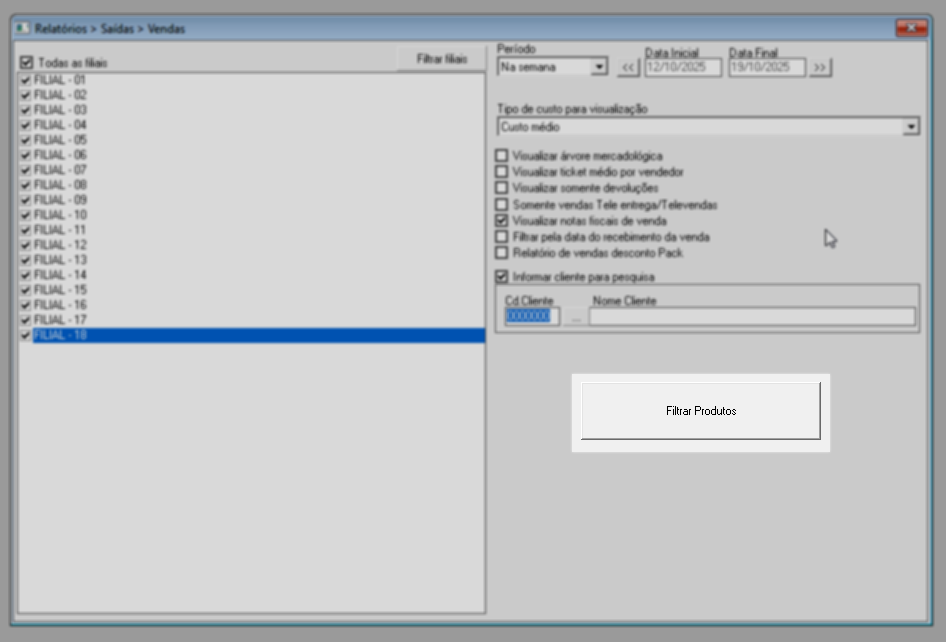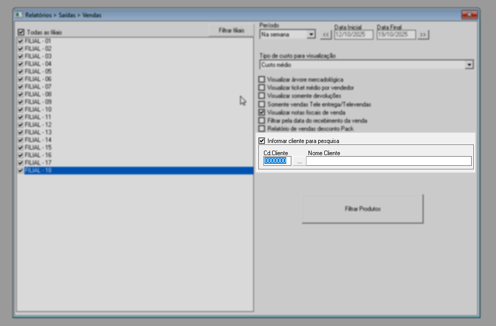Logo após, de acordo com a opção selecionada anteriormente, o usuário poderá, se o recurso estiver habilitado, localizar as vendas de um cliente específico. Para isso, é necessário marcar a opção “Informar cliente para pesquisa”, o que ativará o campo de busca. Em seguida, digite o código do cliente desejado e pressione >> Enter para confirmar a seleção ou clique sobre este botão: "". Assim, a tela em questão será exibida. Clique aqui para aprender a utilizar essa tela de pesquisa.