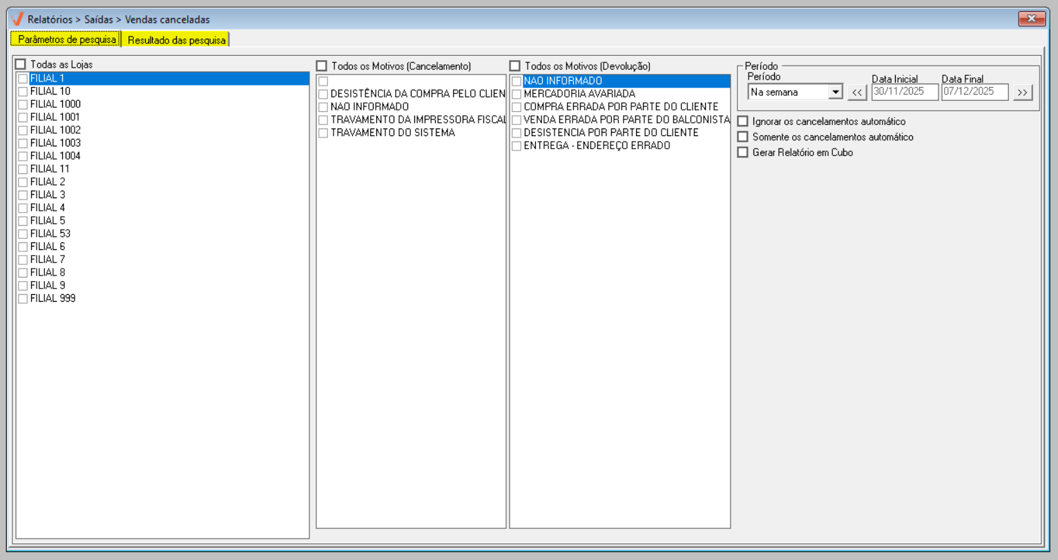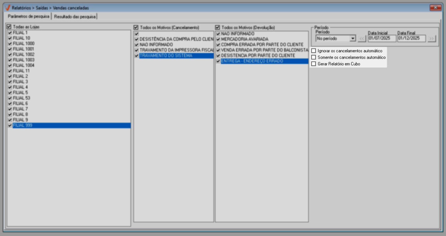 - Ignorar os cancelamentos automáticos: Ignora as vendas que foram automaticamente canceladas pelo sistema, em virtude de algum cancelamento imprevisto da venda.
