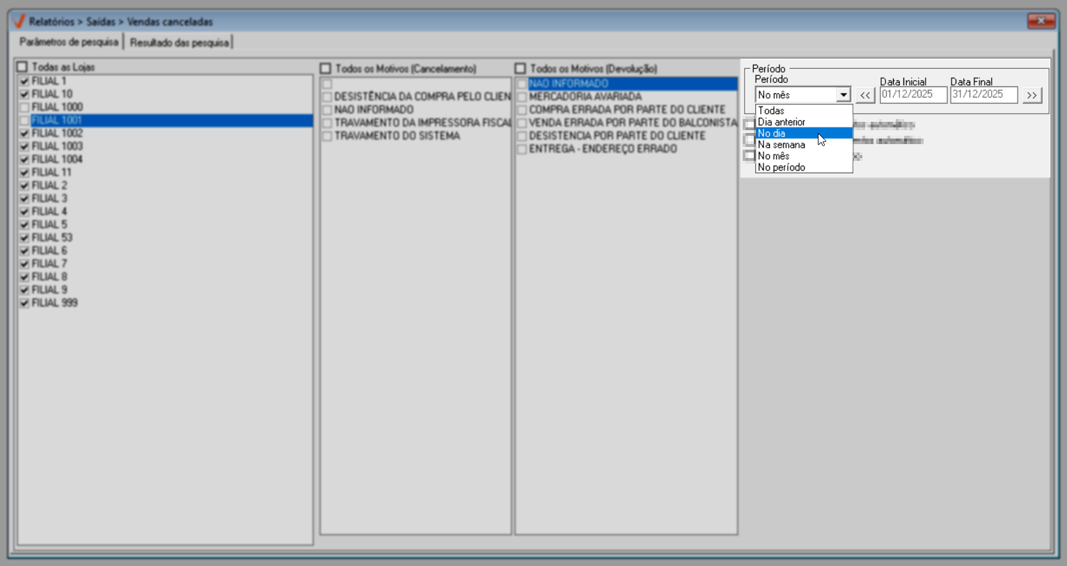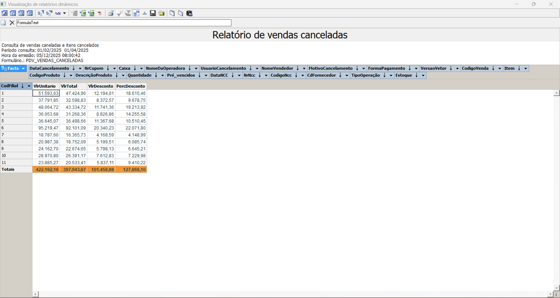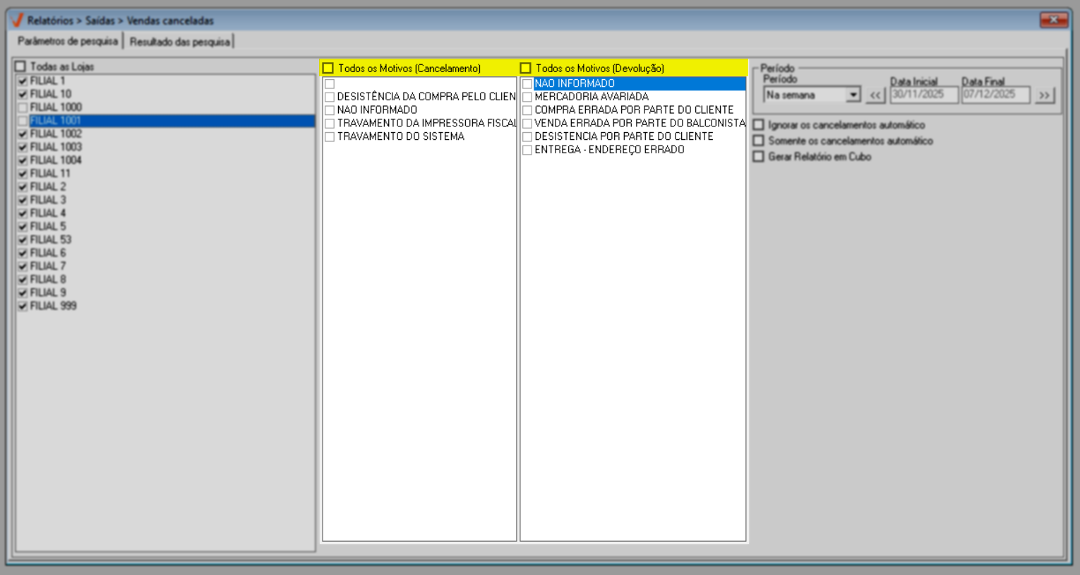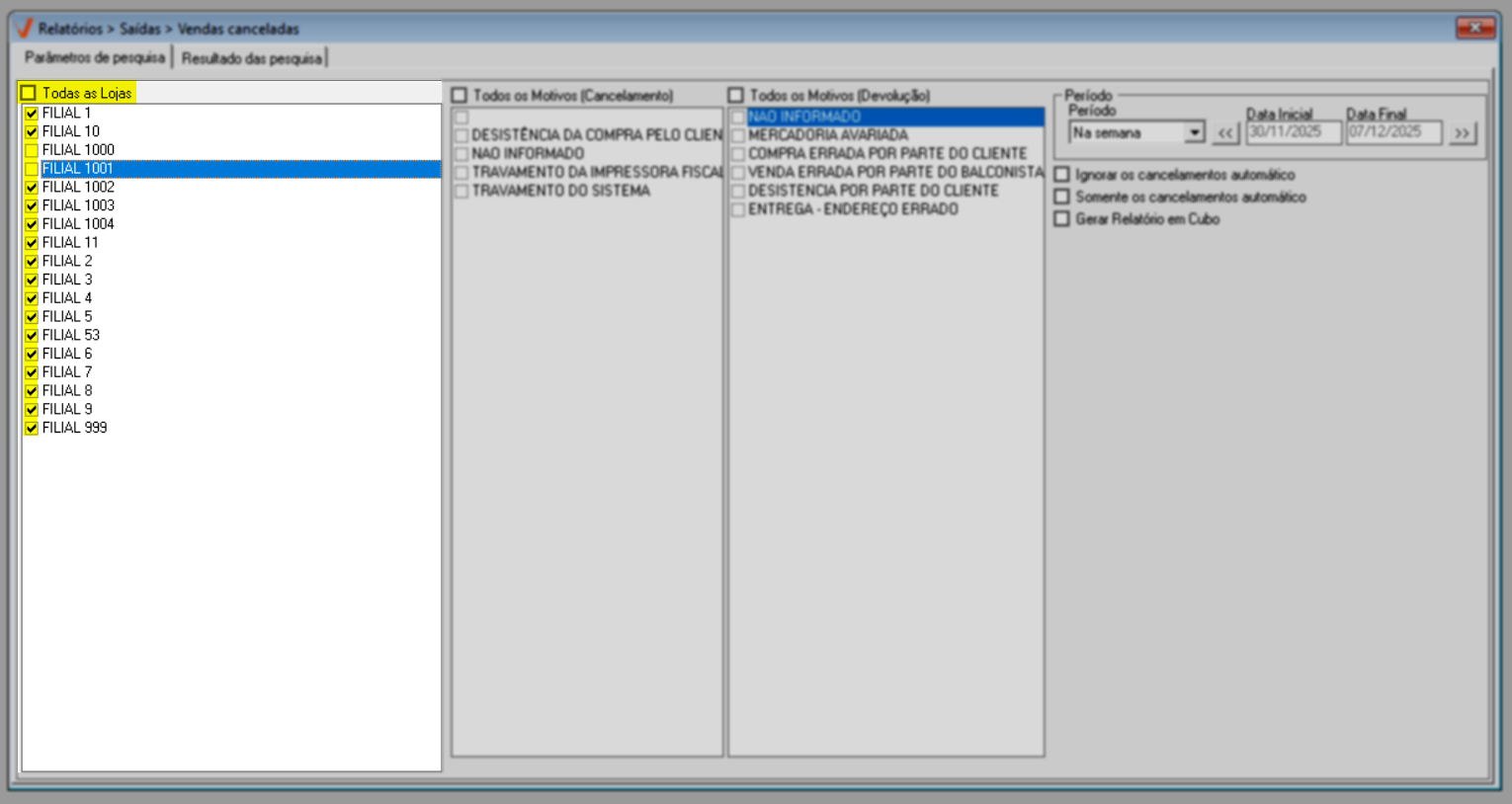 - Filial: Exibe o código da filial onde ocorreu o cancelamento da venda.