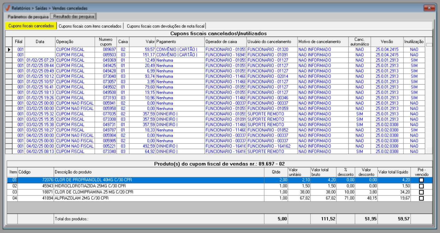 Os cupons classificados como "Inutilizados" também serão exibidos nos relatórios de fechamento de caixa do operador no PDV e no Vetor WEB.