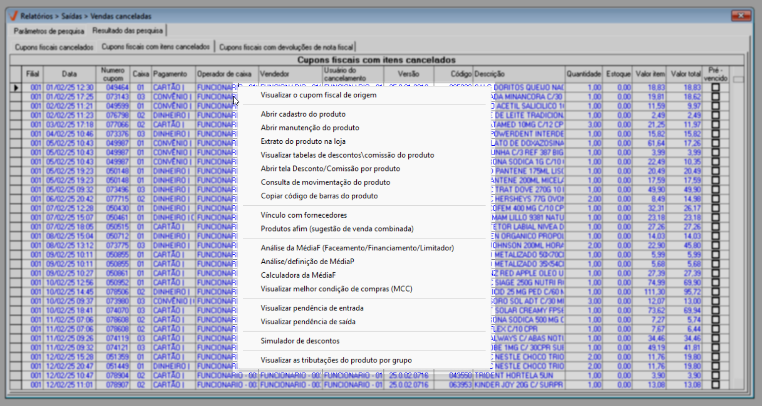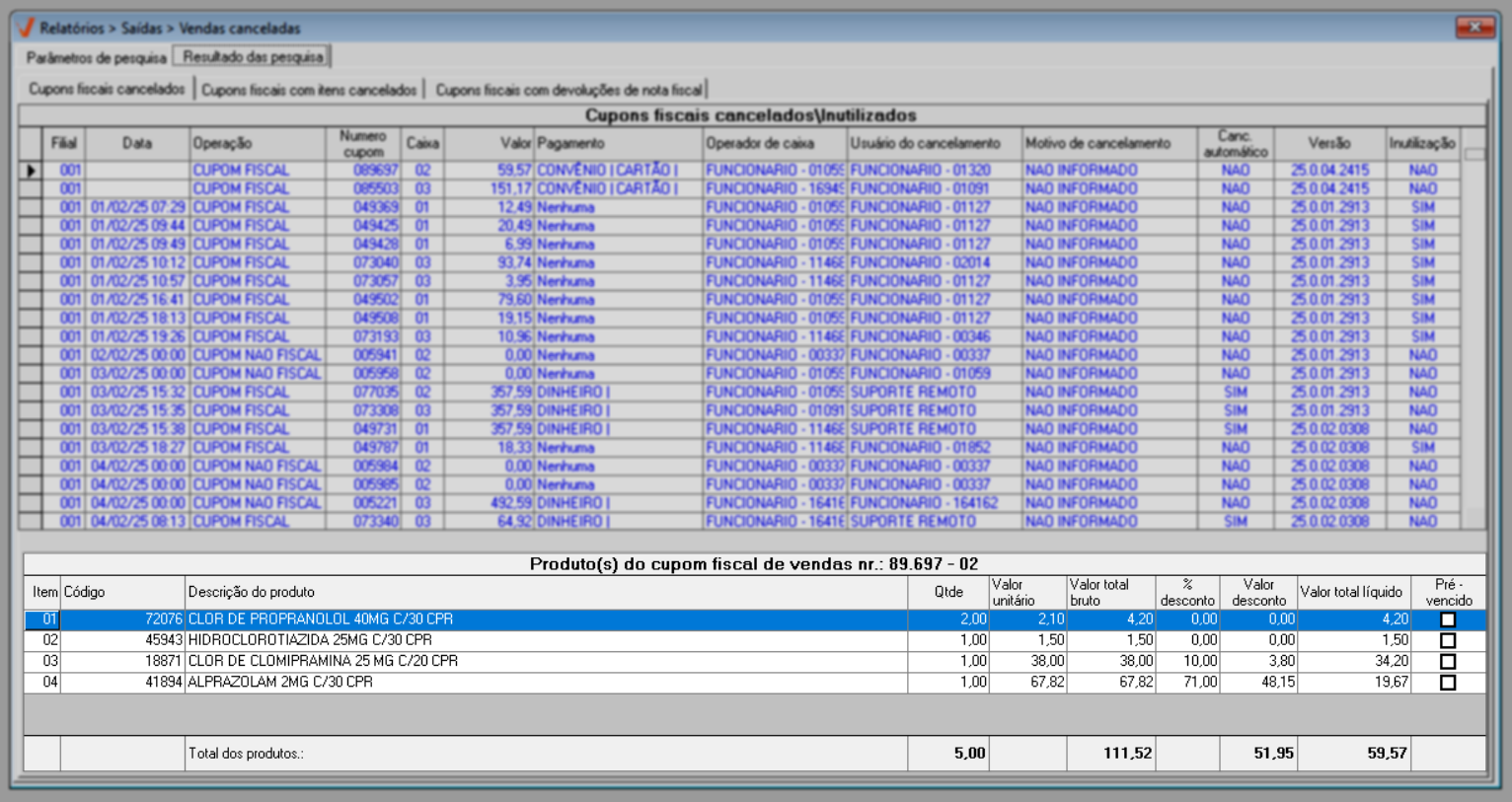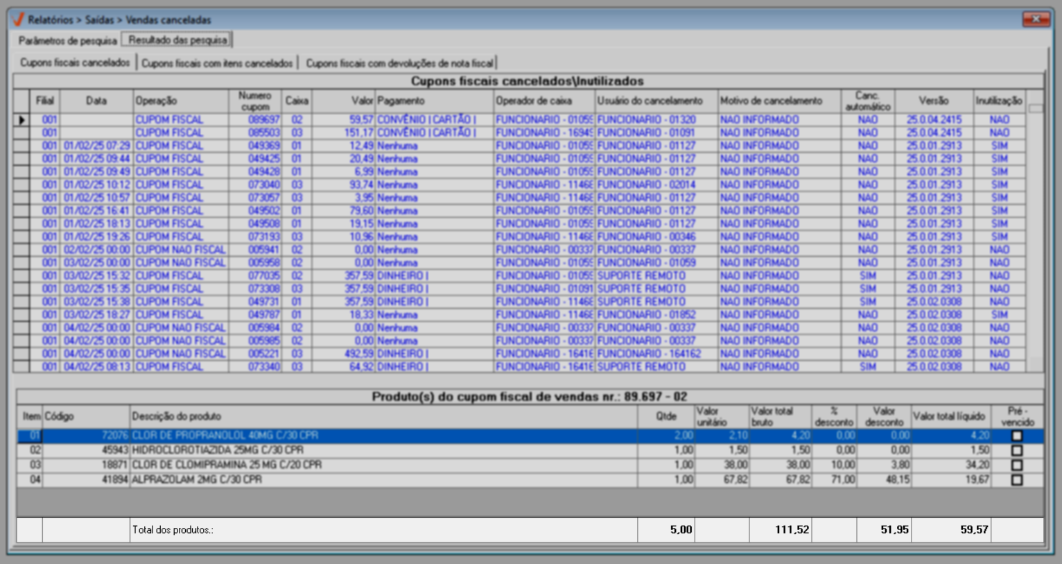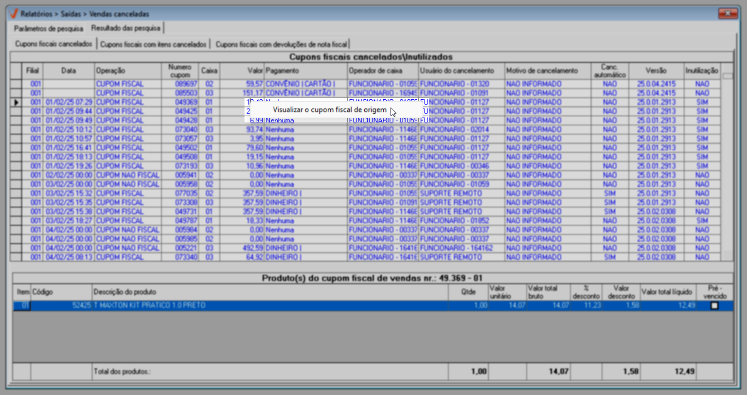 Utilize esta sub-aba para consultar os cupons fiscais que foram cancelados, identificando se o cancelamento ocorreu antes ou depois da sua utilização.