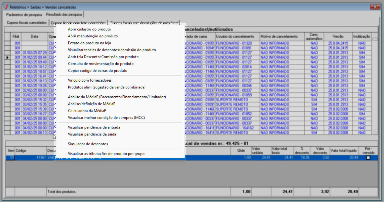 - Usuário do cancelamento: Exibe o nome do usuário que efetuou o cancelamento.