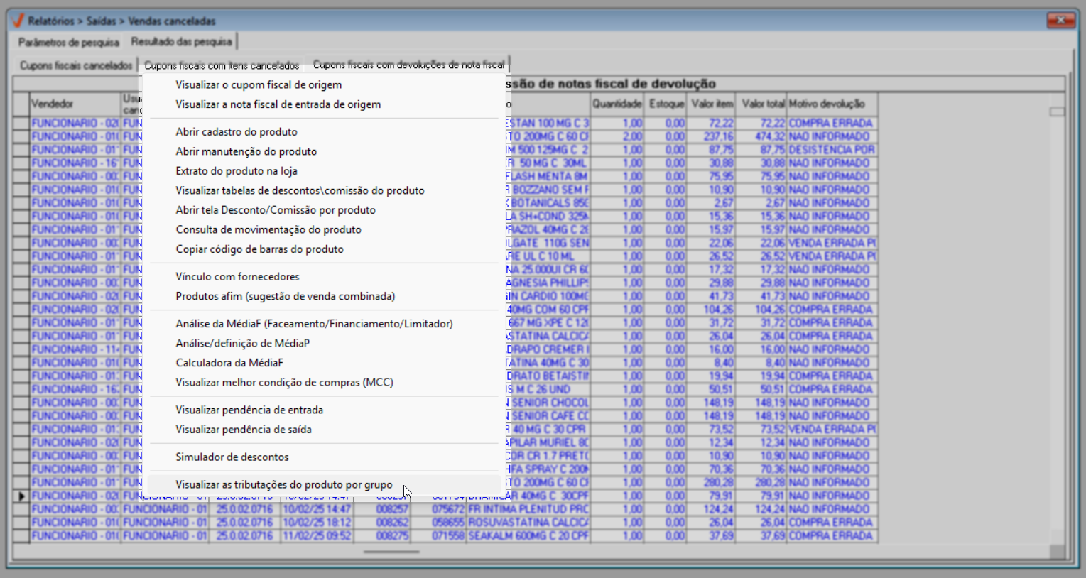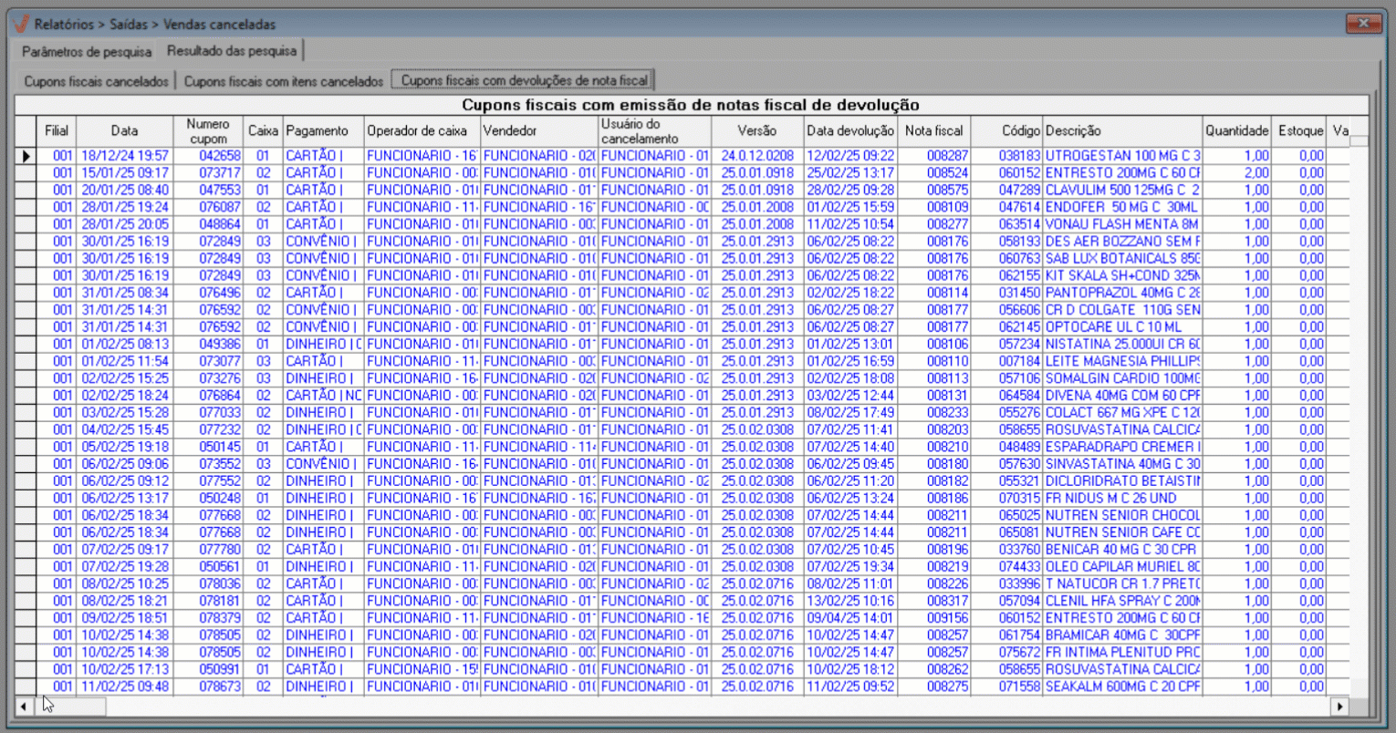 - Usuário do cancelamento: Exibe o nome do usuário que efetuou a devolução.