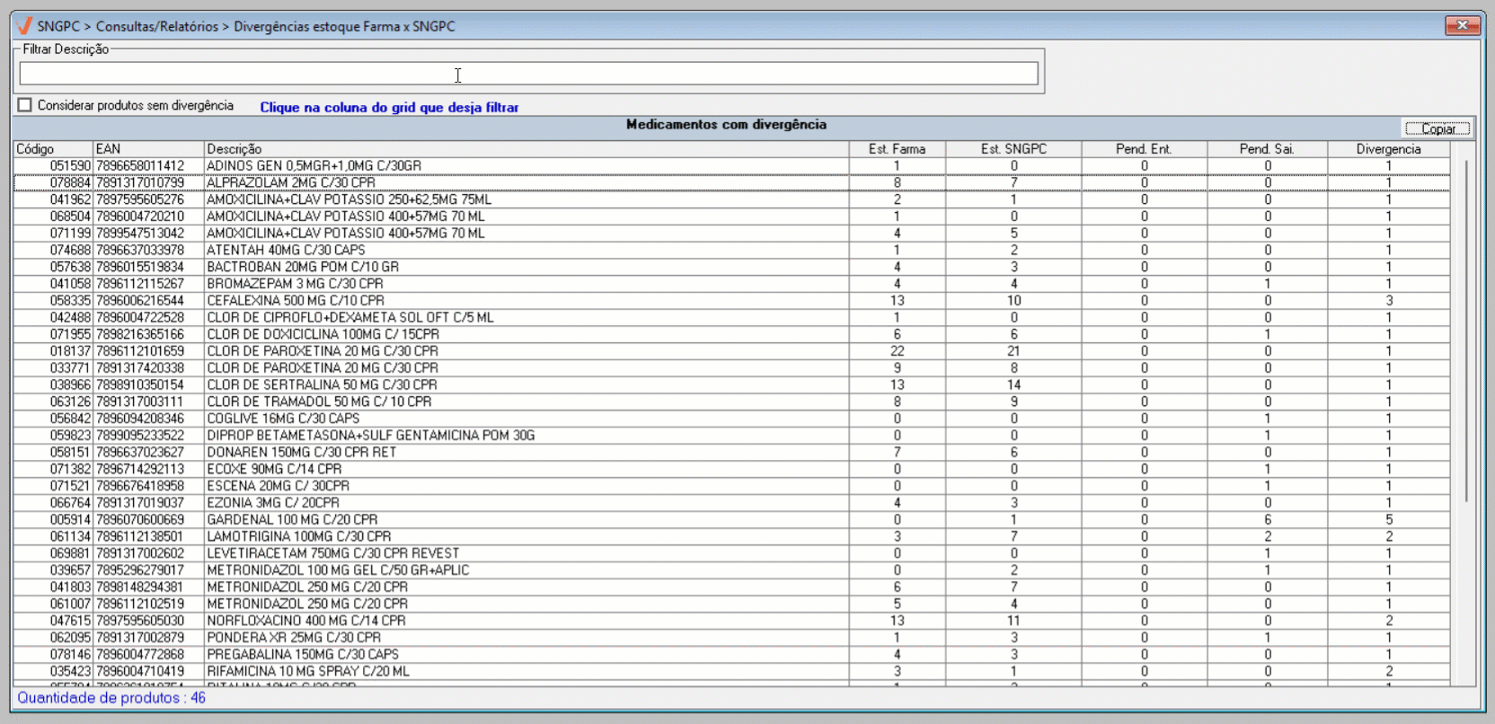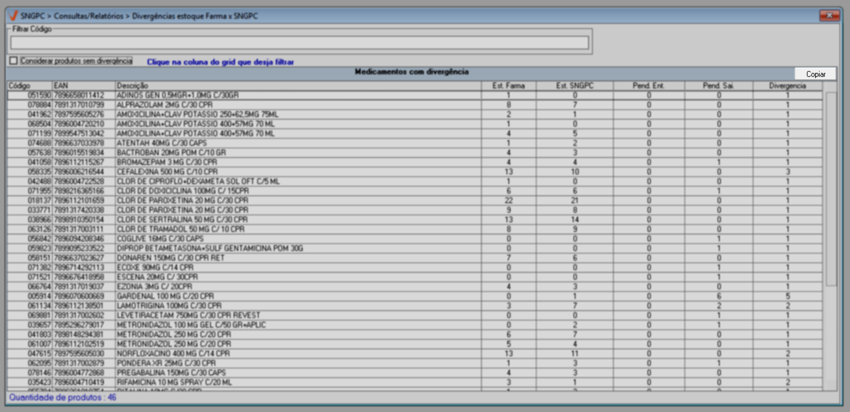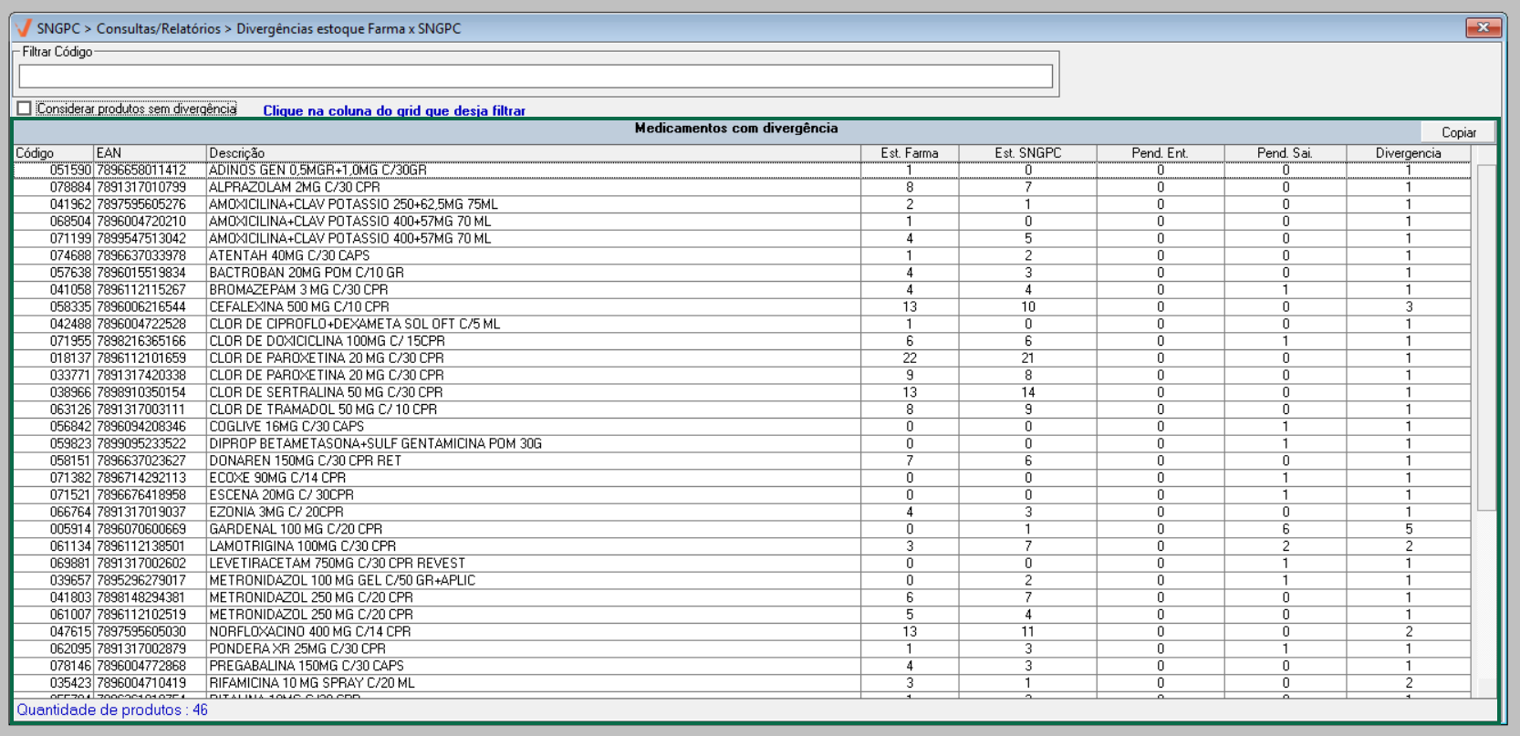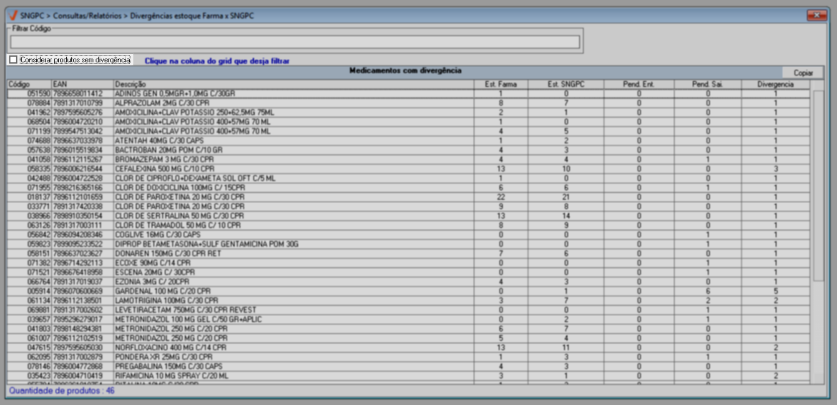 - Acesse o menu: SNGPC >> Consultas/Relatórios >> Divergências estoque Farma X SNGPC.