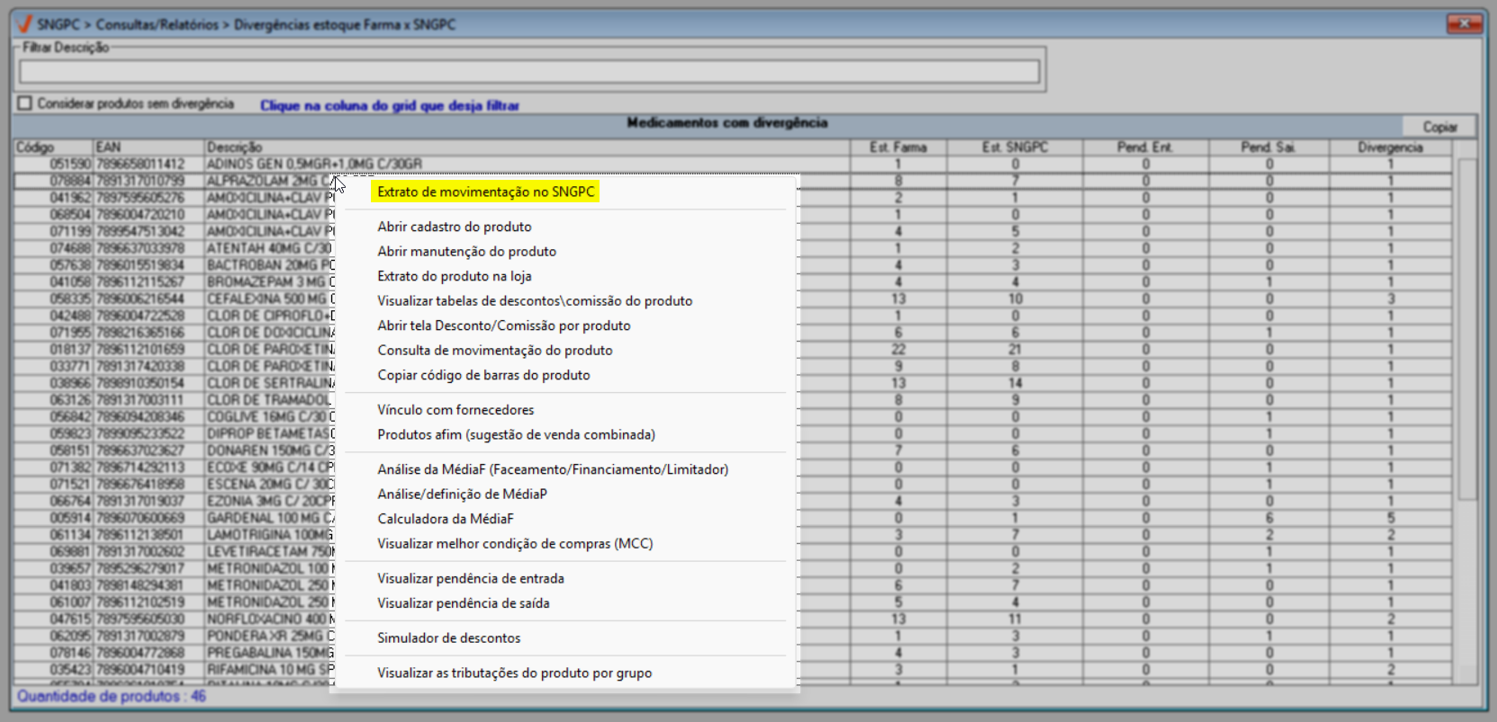 Ao clicar com o botão direito na linha de um produto, serão apresentados vários atalhos que permitem consultar informações sobre o item selecionado. Entre esses atalhos está a opção "Visualizar Movimentação no SNGPC", que tem como intuito facilitar a análise das divergências de estoque. Ao selecionar essa opção, o usuário será redirecionado para a tela "Extrato de movimentação", onde é possível identificar as movimentações enviadas ao SNGPC, auxiliando na verificação da origem das diferenças entre os estoques. Clique aqui para saber mais sobre essa tela.