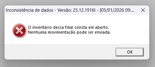 O sistema bloqueará tanto o registro quanto o envio de novas movimentações ao SNGPC caso exista inventário em andamento. Se houver, ao abrir a tela será exibida a seguinte mensagem “O inventário dessa filial consta em aberto. Nenhuma movimentação pode ser enviada”.