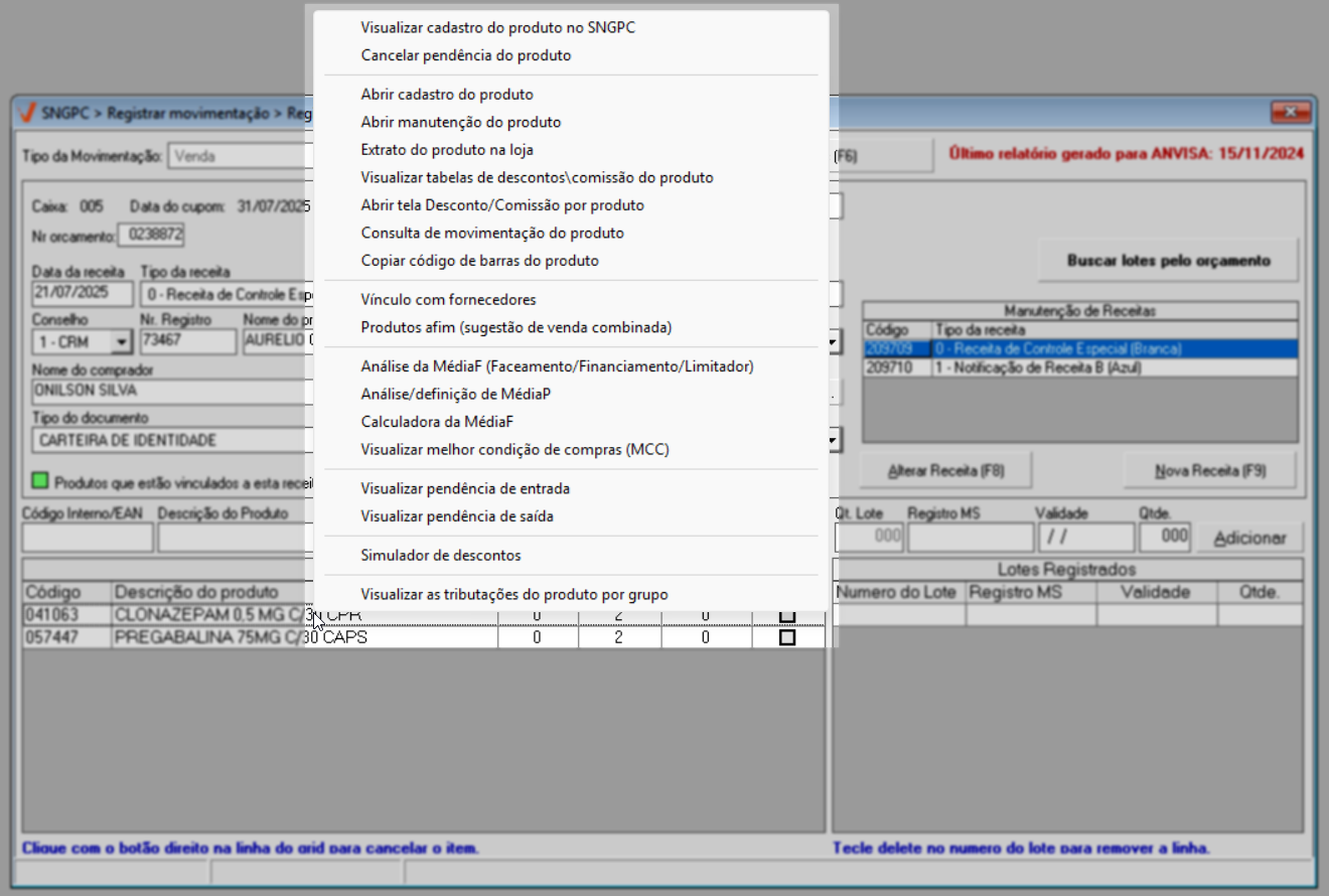 - Movimentações que foram consideradas na geração de arquivos para transmissão à ANVISA não podem ser alteradas, uma vez que estão vinculadas a registros oficiais enviados ao órgão regulador.