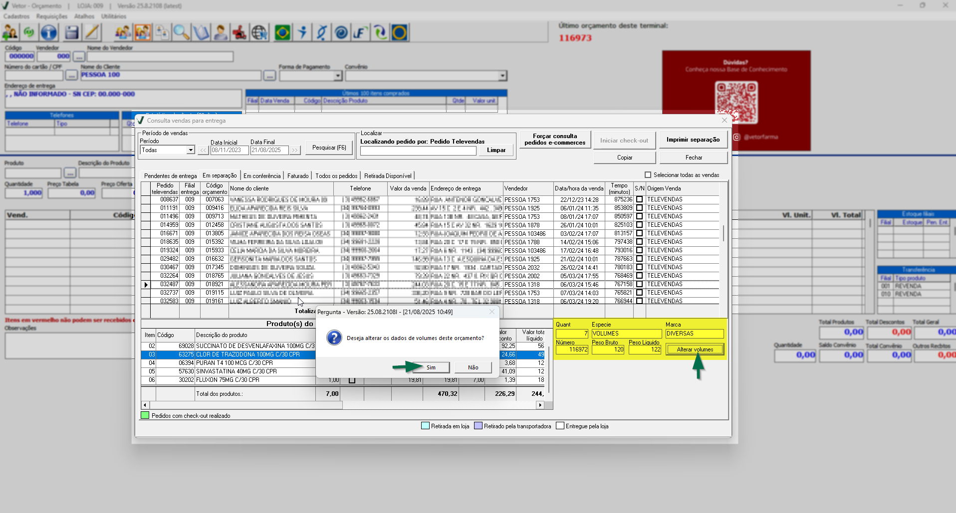 Antes de realizar o faturamento do pedido, também é possível complementar as informações relacionadas aos volumes, no painel localizado à direita da tela. Nessa seção, podem ser definidos a quantidade, a espécie de armazenagem, a marca, o número (corresponde ao código do orçamento), o peso bruto e o peso líquido dos itens. Após o preenchimento, basta clicar em “Alterar volumes” e confirmar a mensagem para que os dados sejam salvos no sistema, logo uma última mensagem será exibida alertando o sucesso da operação.