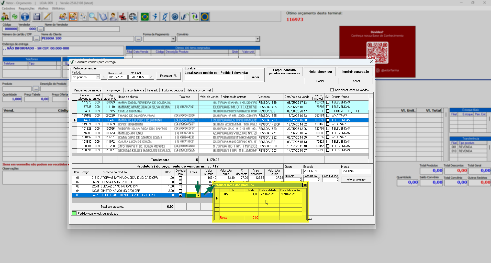 Após habilitar e configurar todos os parâmetros necessários e concluir a etapa “Capturar orçamento para separação”, o próximo passo é registrar os lotes dos produtos sempre que o pedido incluir itens que exijam esse controle. Para isso, selecione a venda desejada e, no quadro a baixo à esquerda denominado “Produtos do orçamento de vendas”, identifique quais produtos possuem lote. Essa indicação aparece na coluna “Controla lote”; quando marcada. Confira a explicação na imagem a seguir: