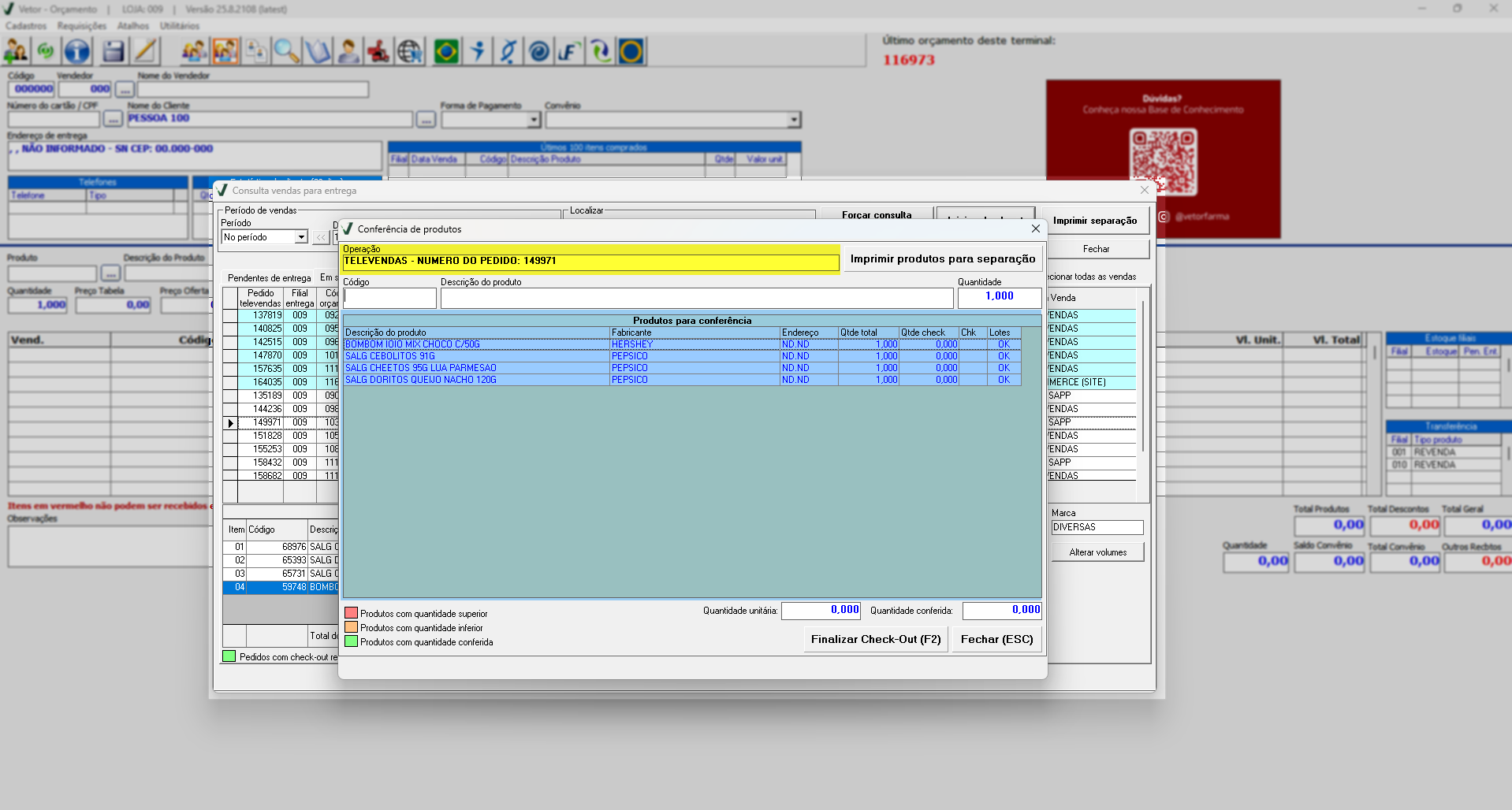 Após essa confirmação, a tela de Check-out será exibida, na qual, o campo "Operação" divulgará o tipo de operação junto com o número do pedido correspondente. Na seção "Produtos para conferência", será exibida a lista de produtos que compõem o orçamento.