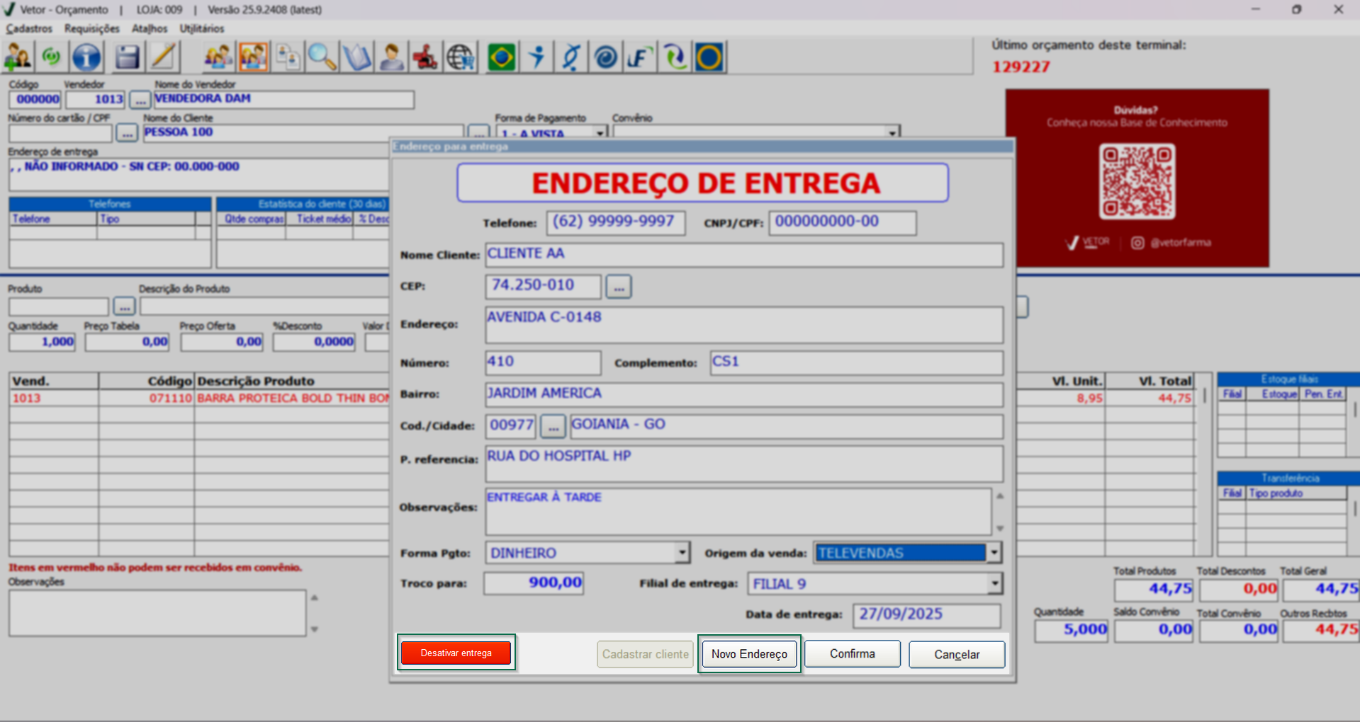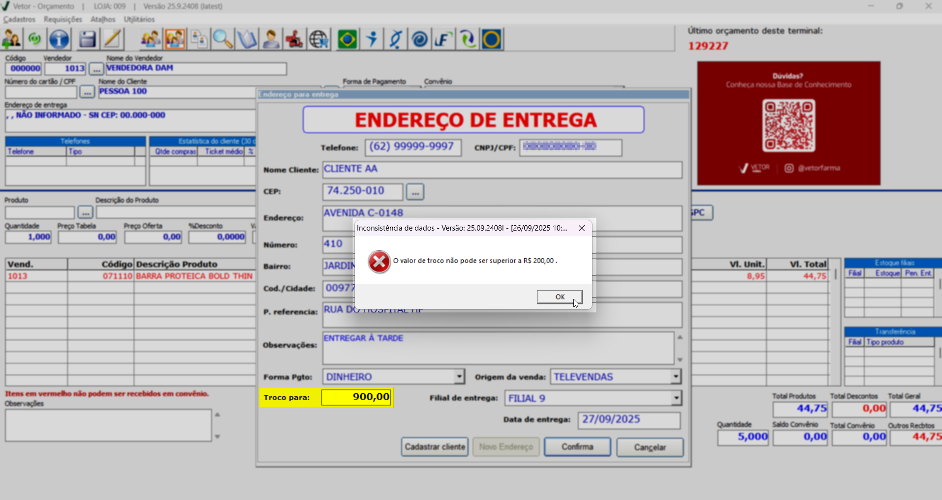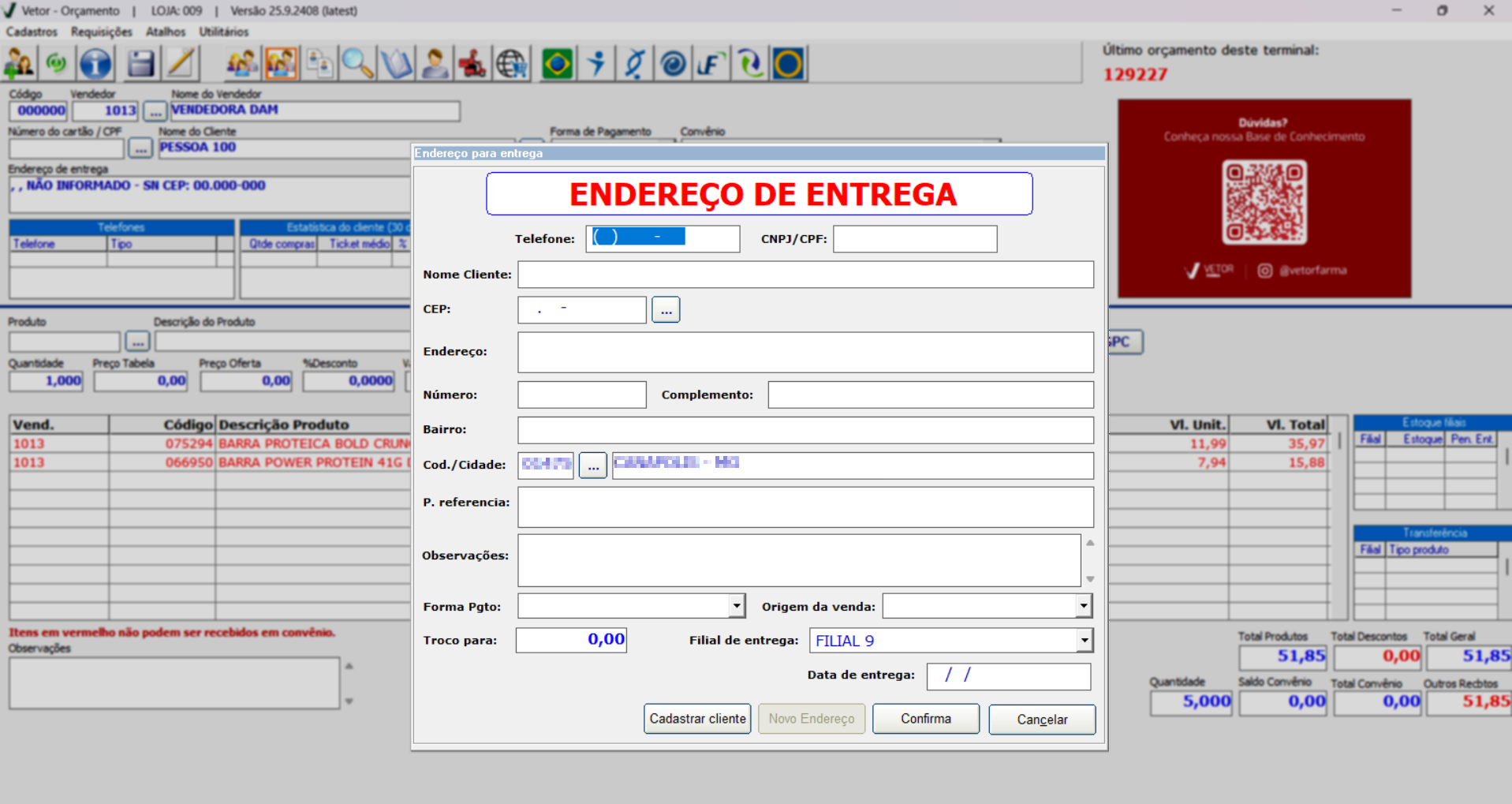 Contudo, é importante lembrar que, caso o cliente esteja cadastrado, mas não possua um CPF válido em seu cadastro, será necessário verificar a configuração do parâmetro adicional OBRIGA_PREENCHIMENTO_CPF_TELEVENDAS. Se esse parâmetro estiver habilitado para exigir CPF válido no orçamento com entrega, e o campo não estiver preenchido corretamente, não será possível confirmar o endereço de entrega, ao tentar confirmar, o sistema exibirá uma advertência.