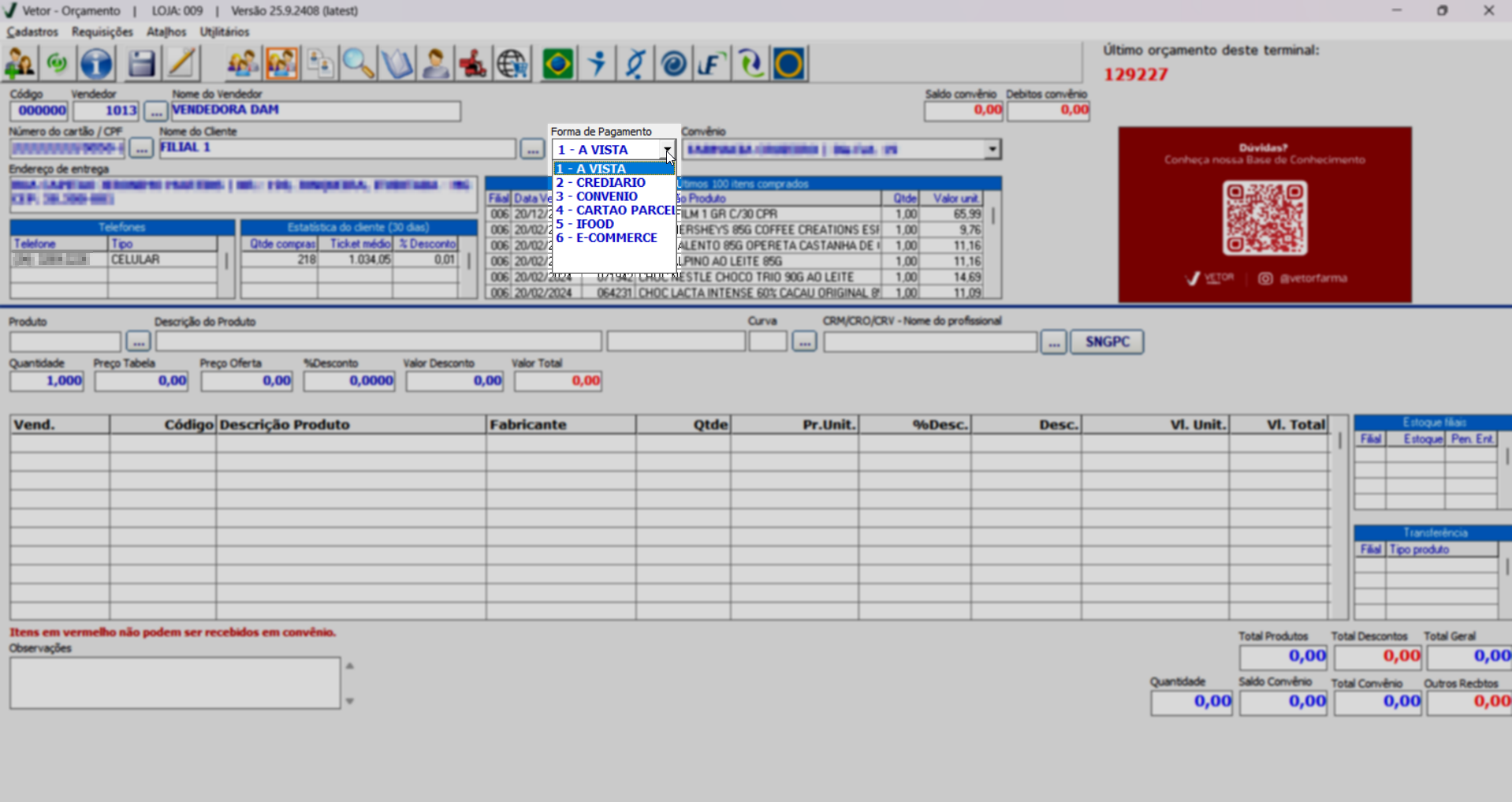 Na tela de orçamento, informe o vendedor e os produtos que irão compor o orçamento. Se o cliente possuir cadastro, informe-o, ou continue como consumidor final.