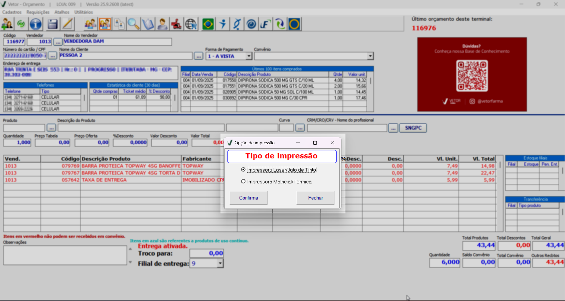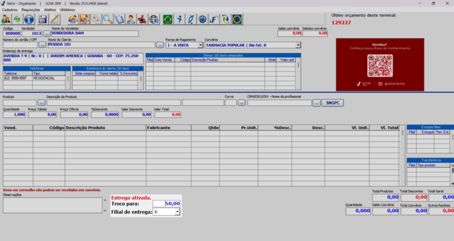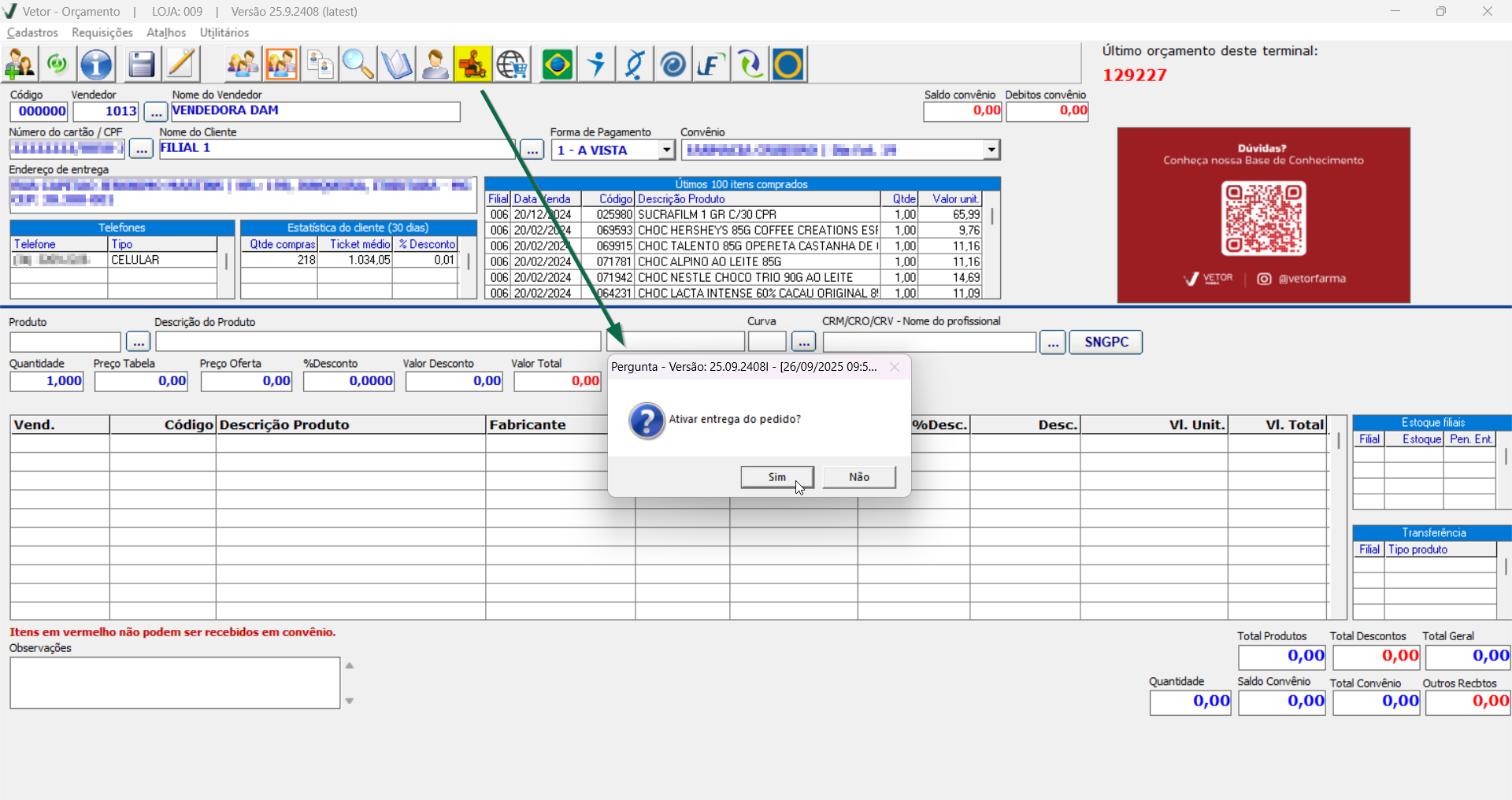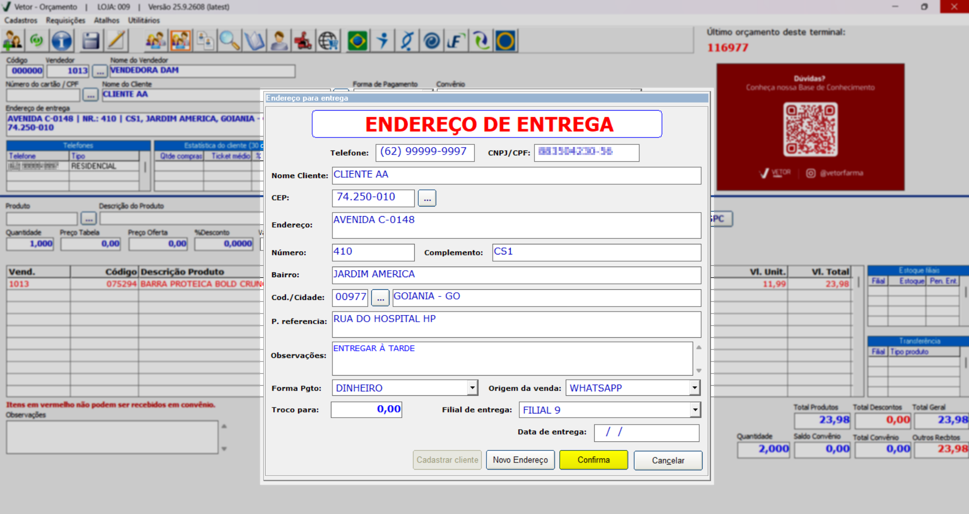 Após inserir e confirmar os dados de entrega, o sistema fechará a tela de "Endereço para entrega" e exibirá no rodapé da tela de orçamento, a mensagem: "Entrega ativada". Caso a empresa adote a cobrança de taxa de entrega, será necessário inserir essa informação. Clique aqui e veja os detalhes. No entanto, se a empresa não adota a cobrança de taxa de entrega, basta teclar F2 para salvar o orçamento e clicar em "Sim" para finalizar.