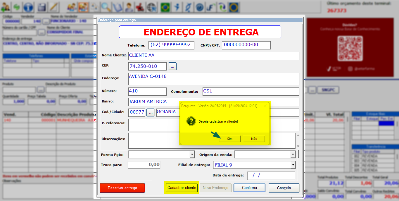 Caso deseje cadastrar o cliente, será preciso informar todos os dados básicos solicitados, "Telefone", "CNPJ/CPF" válido e "Endereço". A seguir, clique em >> Cadastrar cliente e confirme a mensagem seguinte.