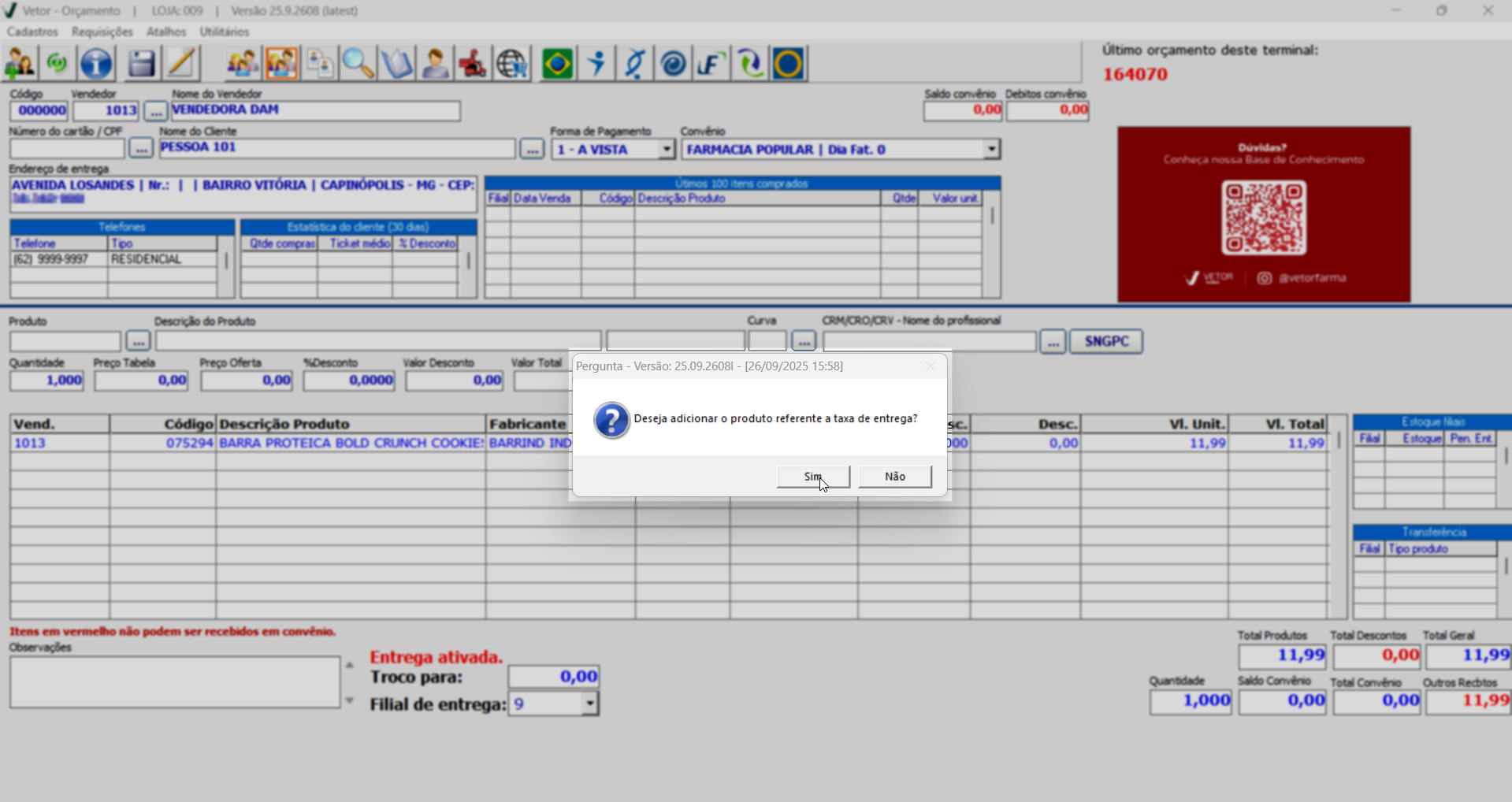 Portanto, se o parâmetro estiver configurado para "Perguntar se deseja adicionar taxa de entrega", após confirmar os dados para entrega, será exibida a seguinte pergunta: "Deseja adicionar o produto referente a taxa de entrega? "Clique em "Sim" para confirmar.