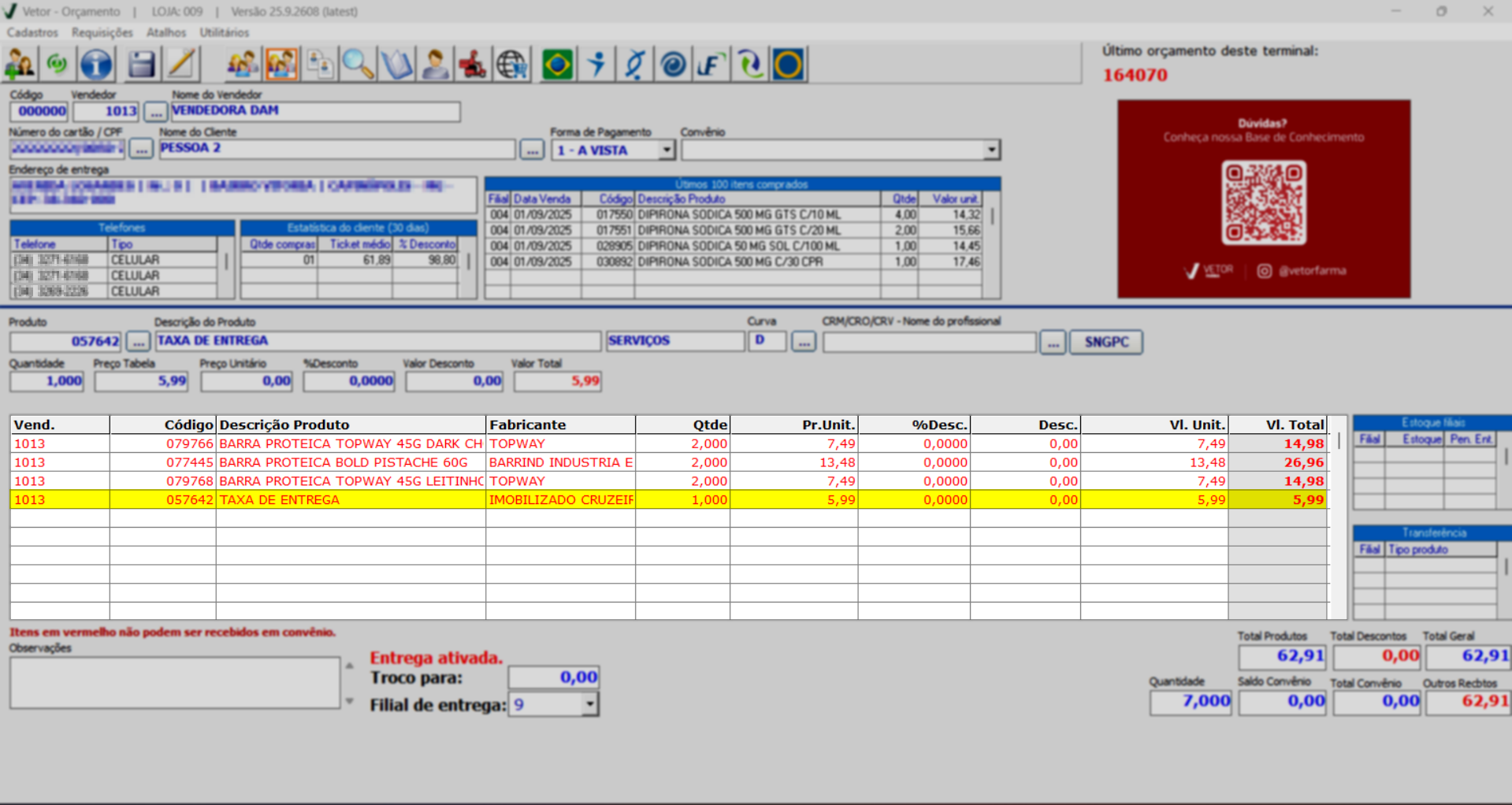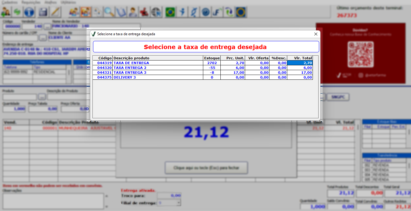 Mas, se o parâmetro estiver configurado para "Adicionar taxa de entrega automático", após confirmar os dados para entrega, o item será incluído ao orçamento de forma automática.