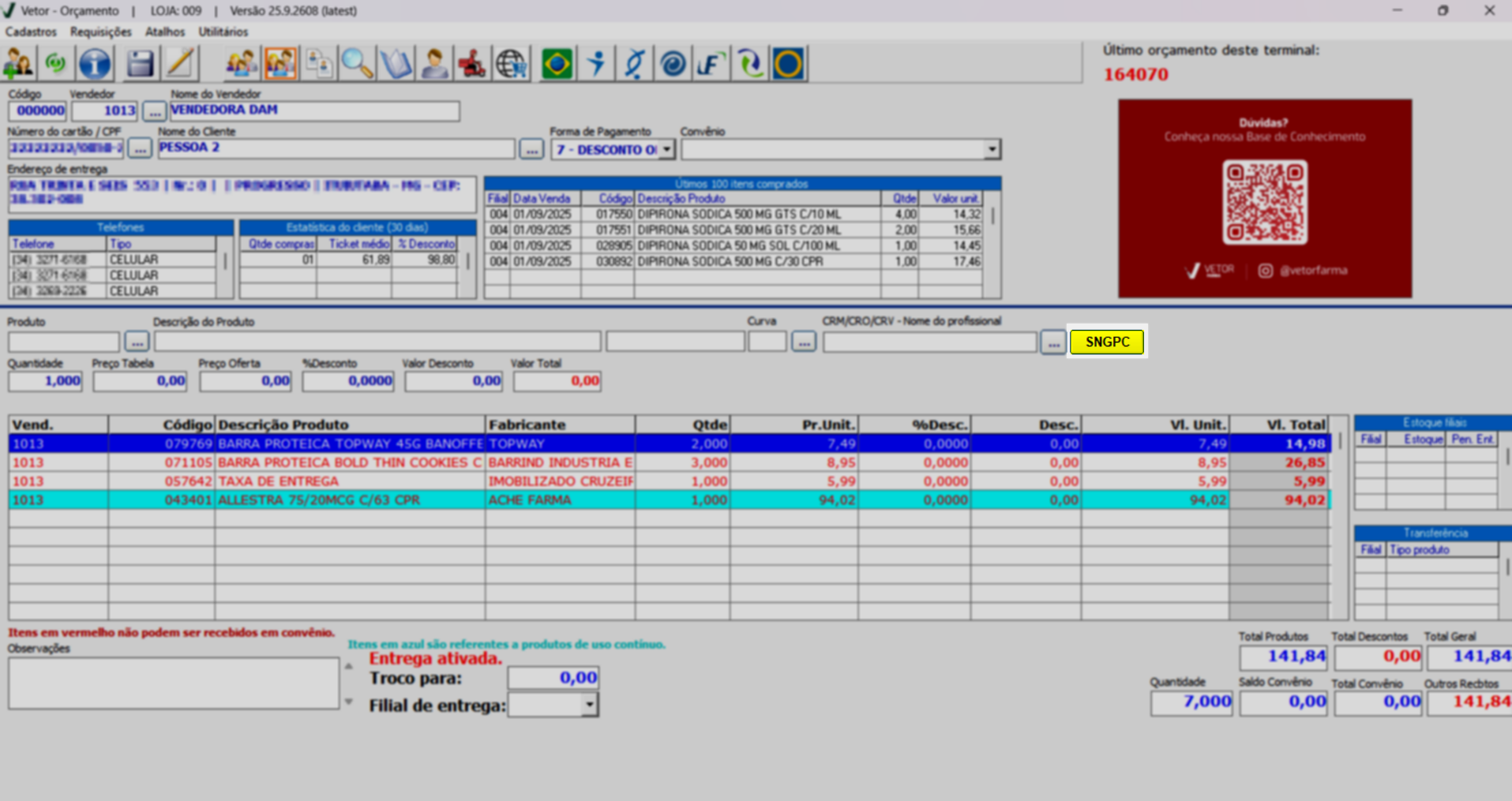 Se a empresa tiver habilitado o parâmetro que obriga a apresentação da receita médica para a venda de medicamentos, originados de "Tele-entregas" ou "Tele vendas" com controle SNGPC, será necessário identificar a receita médica do medicamento. Para alertar o usuário sobre essa exigência, o botão SNGPC do produto será destacado em verde, indicando que o vendedor/atendente deve informá-la.