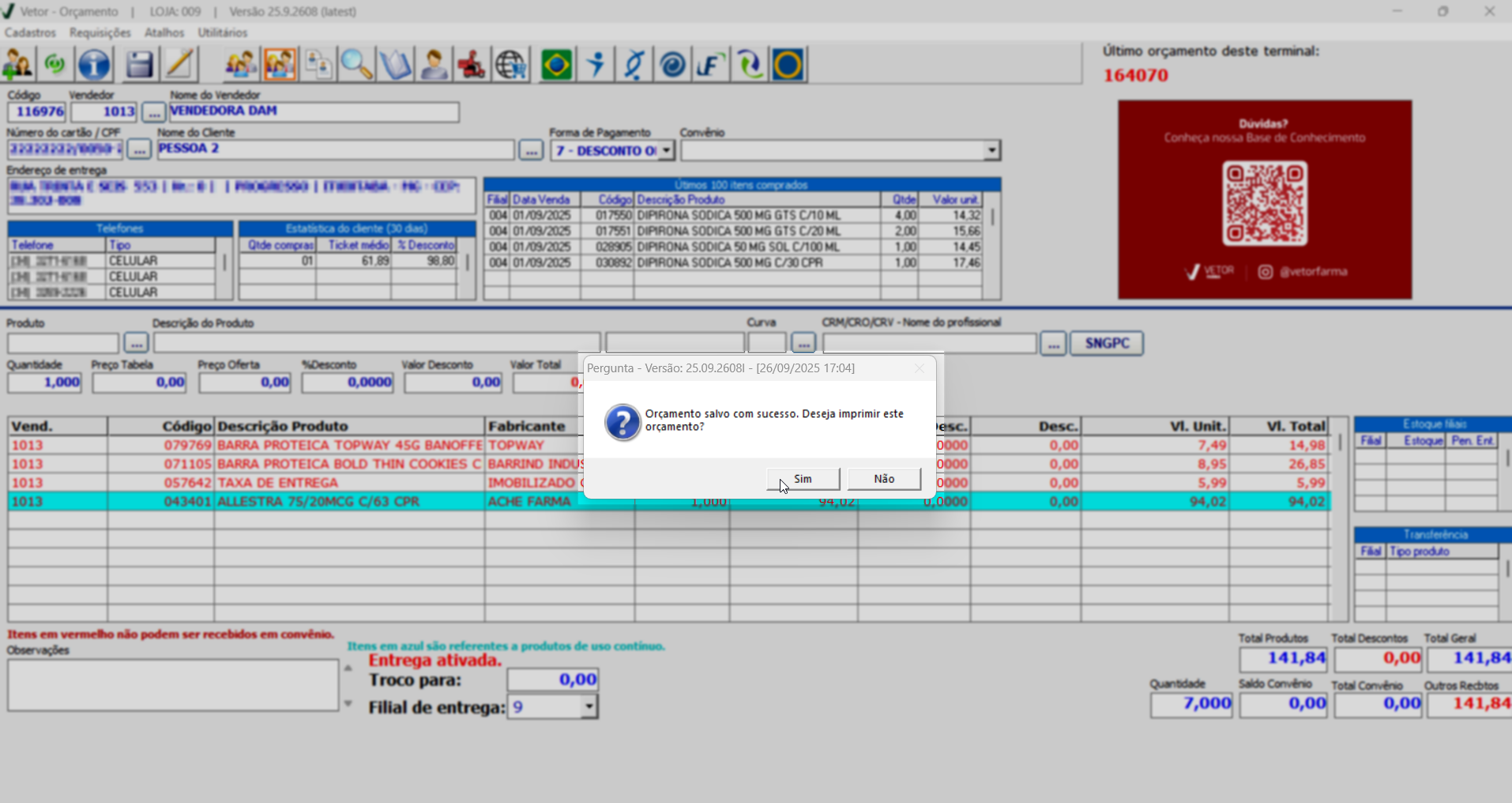 Se o orçamento não possui restrições, ao teclar o atalho F2 e confirmar a operação, a operação será concluída com sucesso. Após, o sistema questionará o usuário se deseja imprimir o orçamento.