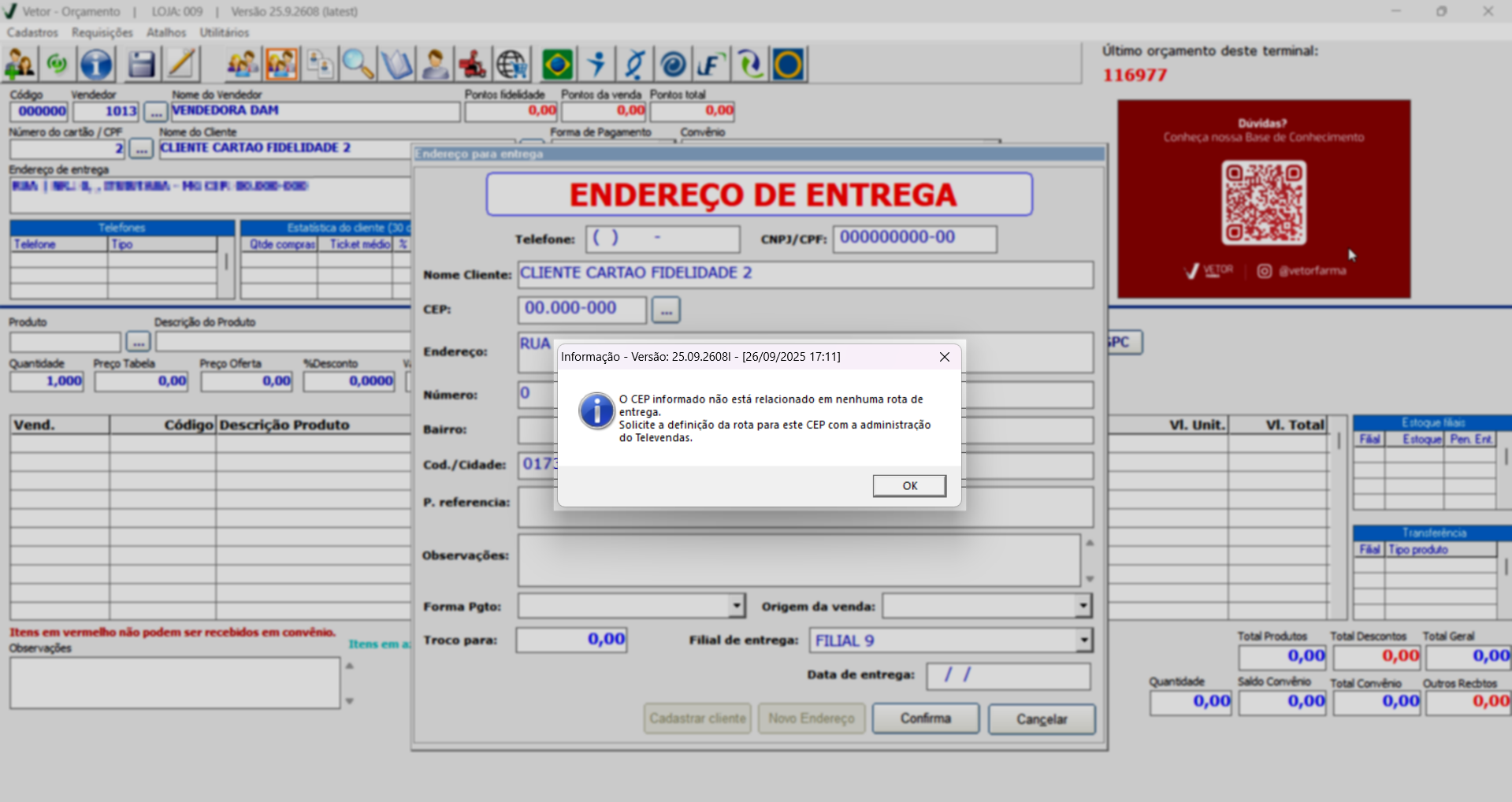 É necessário que o CEP informado esteja registrado no cadastro de rotas do sistema. Para mais informações sobre esse cadastro, clique aqui. Se o CEP não estiver cadastrado, o sistema exibirá a seguinte mensagem de alerta: