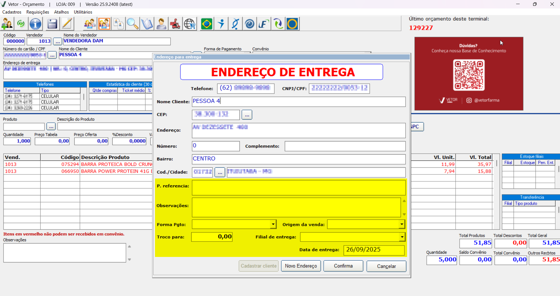 Para gerar o orçamento para um "Consumidor final", informe os dados necessários para a entrega como: "Telefone", "Nome do Cliente", "CEP"," Endereço", "Número", "Complemento", "Bairro", "Cidade" e "P. referência".