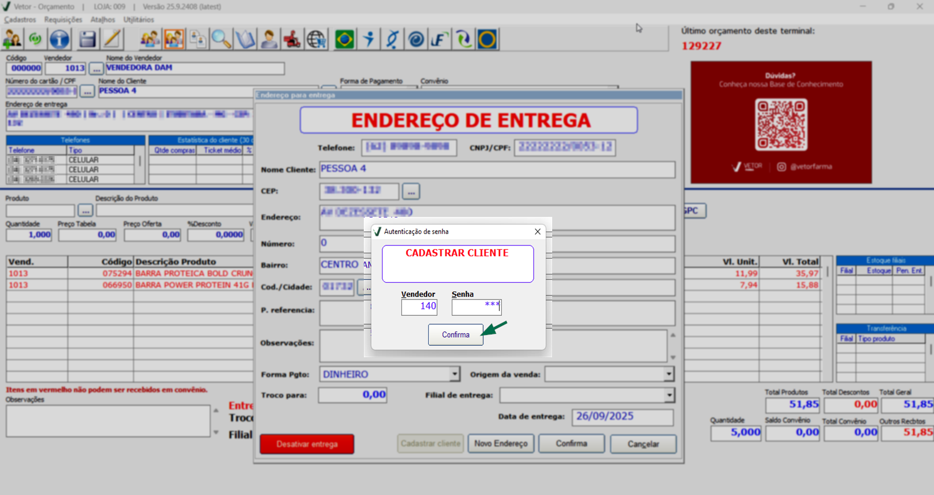 Para realizar o cadastro do cliente, o vendedor deverá possuir permissão concedida no sistema Vetor Farma. Após informar as credenciais, clique em "Confirma".