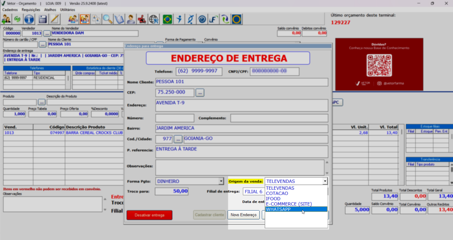 Por padrão, o sistema irá sugerir a origem da venda como: "Televendas", no entanto, conforme a necessidade o usuário poderá selecionar a opção desejada. Consulte o artigo "Origem da venda" e saiba mais.