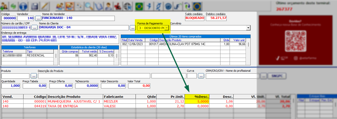 Portanto, se o produto fizer parte da regra de desconto por forma de pagamento configurada, o desconto será atribuído. Se necessário, o sistema recalculará o desconto e atualizará a "Forma de pagamento" informada no início do orçamento para considerar o padrão estabelecido para orçamentos com entrega, portanto, desabilitará o campo impedindo sua alteração.