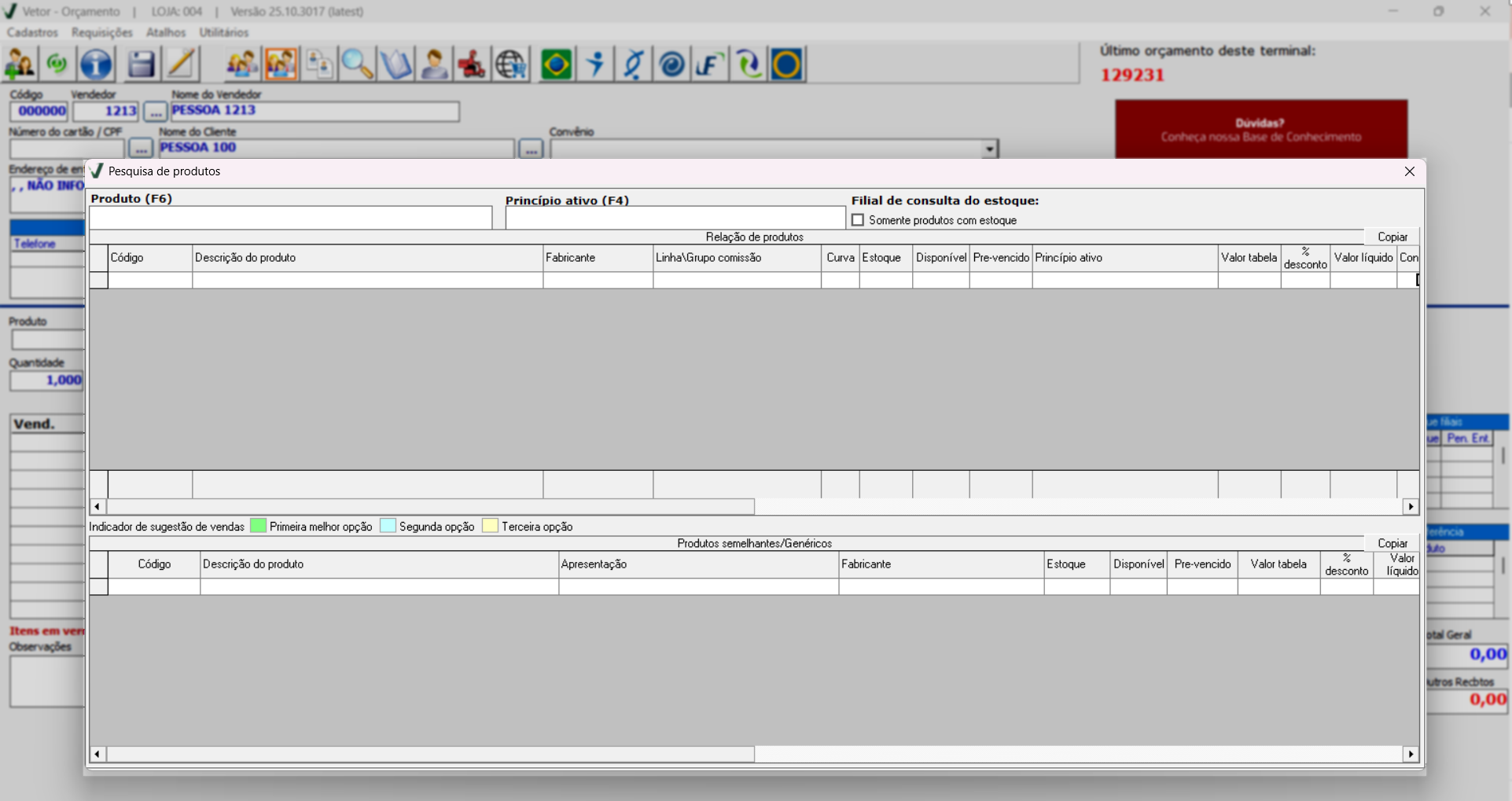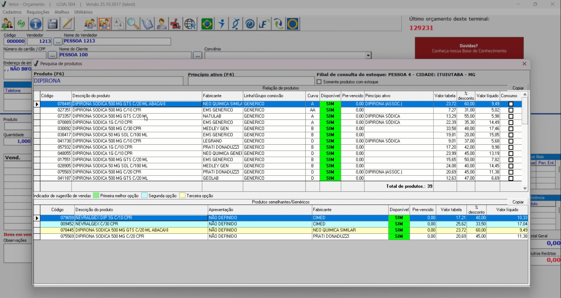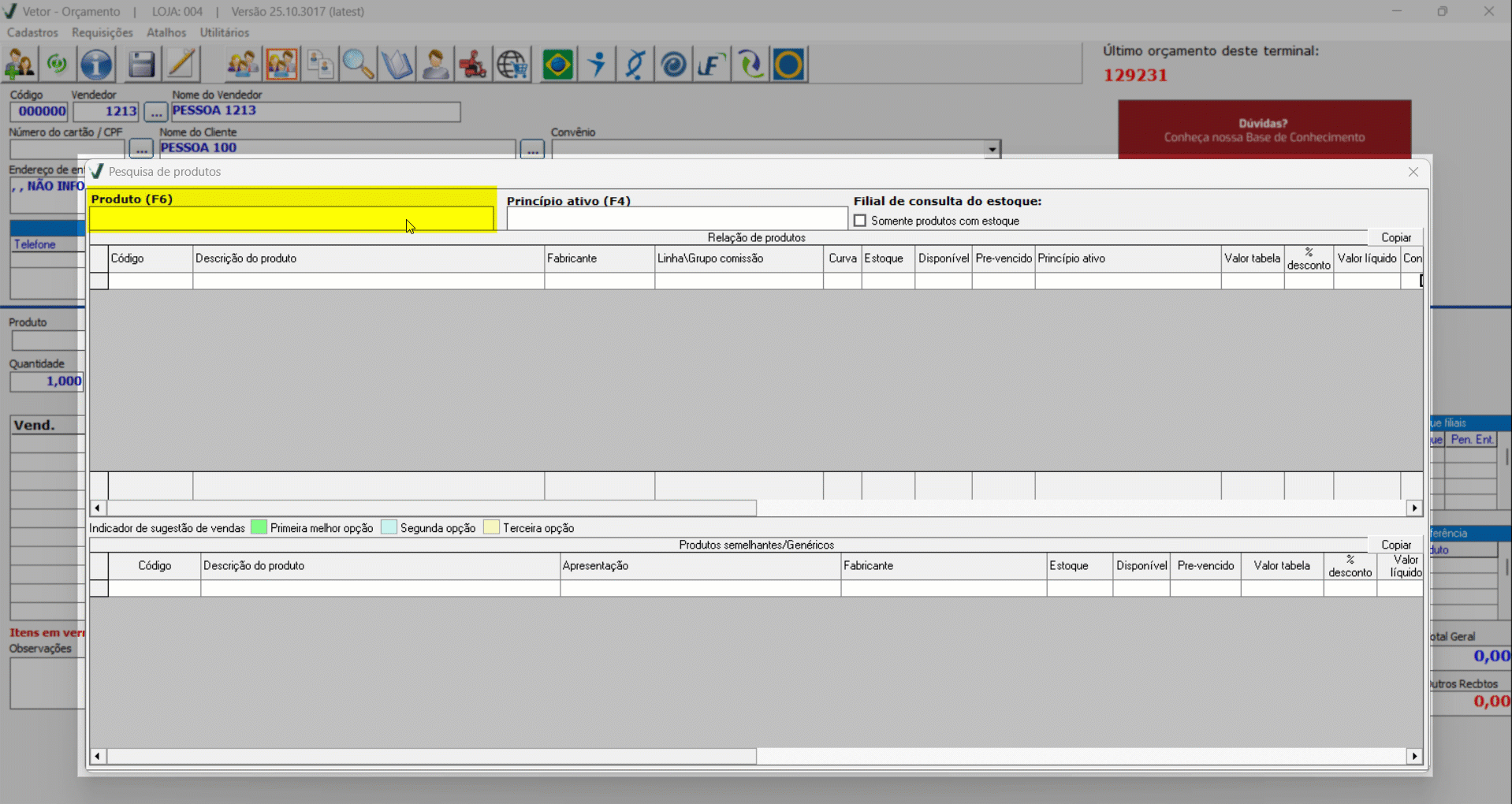 Após analisar os produtos consultados, é possível incluir os de interesse em um novo orçamento. Para isso, basta dar um duplo clique sobre o produto desejado, que será automaticamente adicionado a um novo orçamento com o mesmo vendedor selecionado ao abrir a tela.