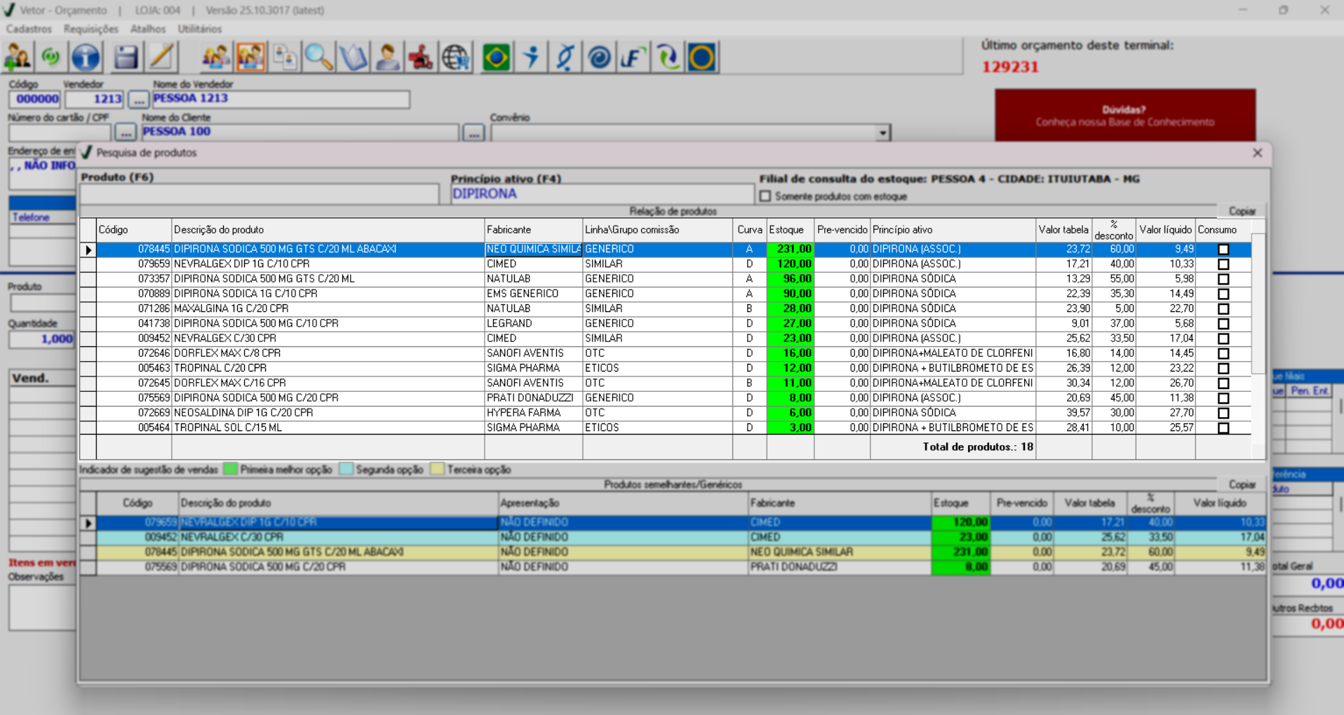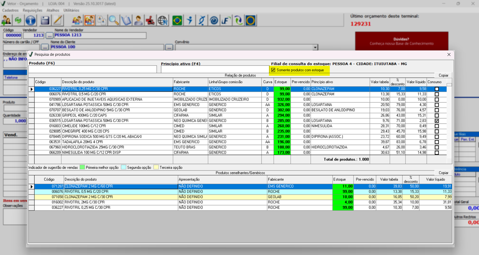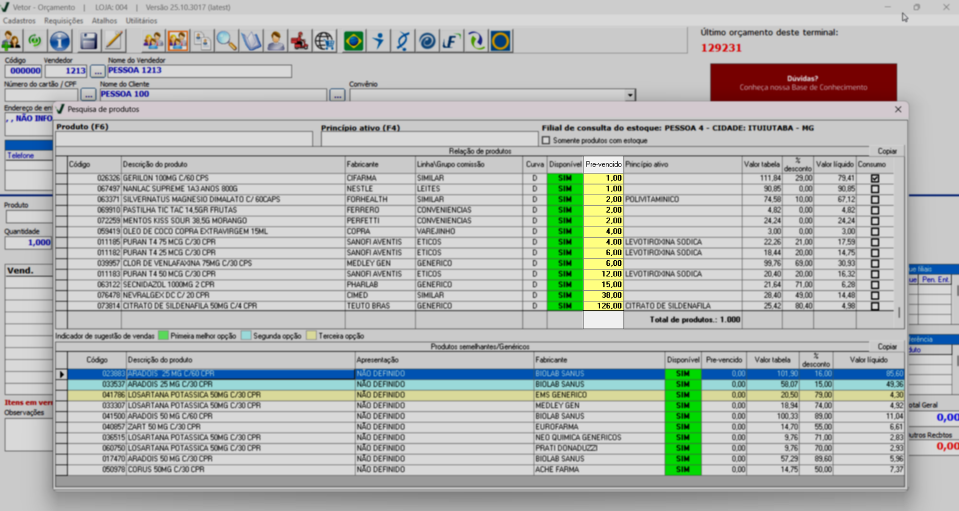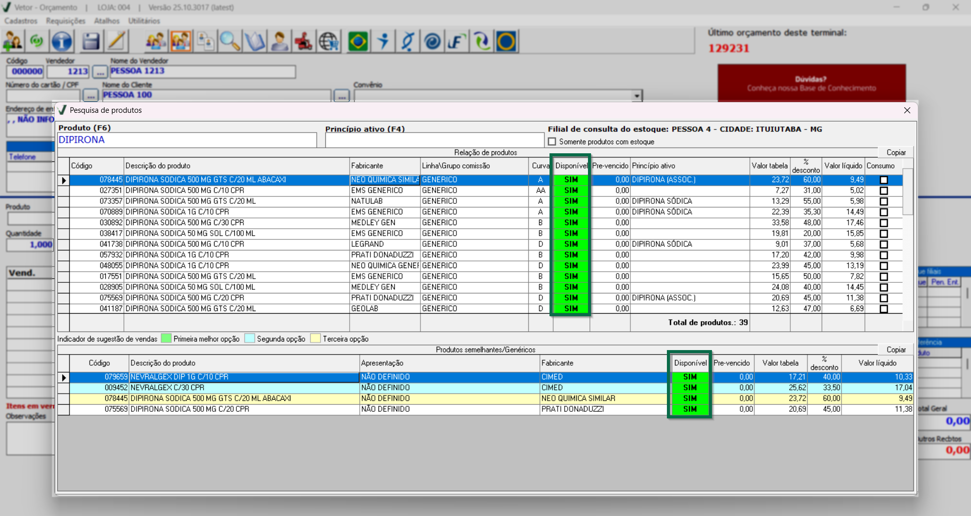 Após analisar os produtos consultados, é possível incluir os de interesse em um novo orçamento. Para isso, basta dar um duplo clique sobre o produto desejado, que será automaticamente adicionado a um novo orçamento com o mesmo vendedor selecionado ao abrir a tela.