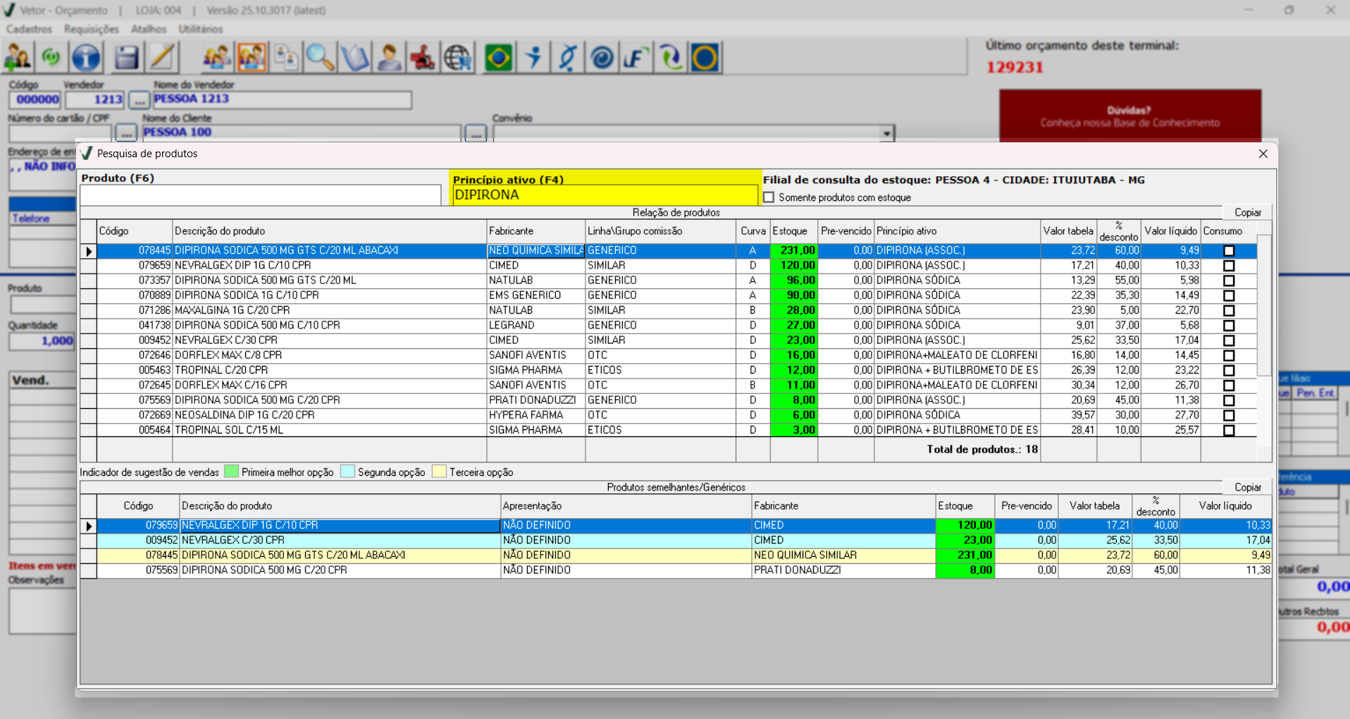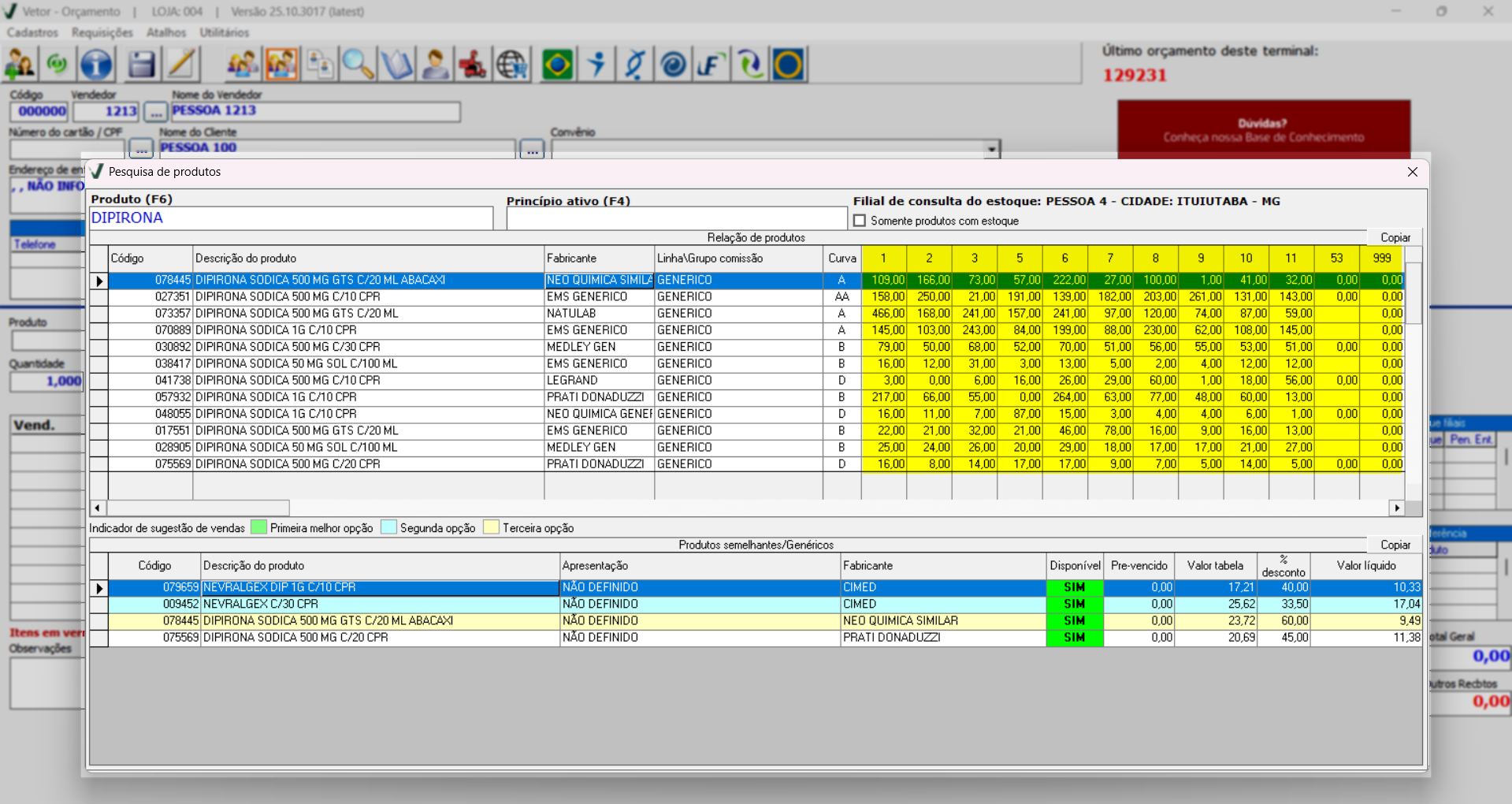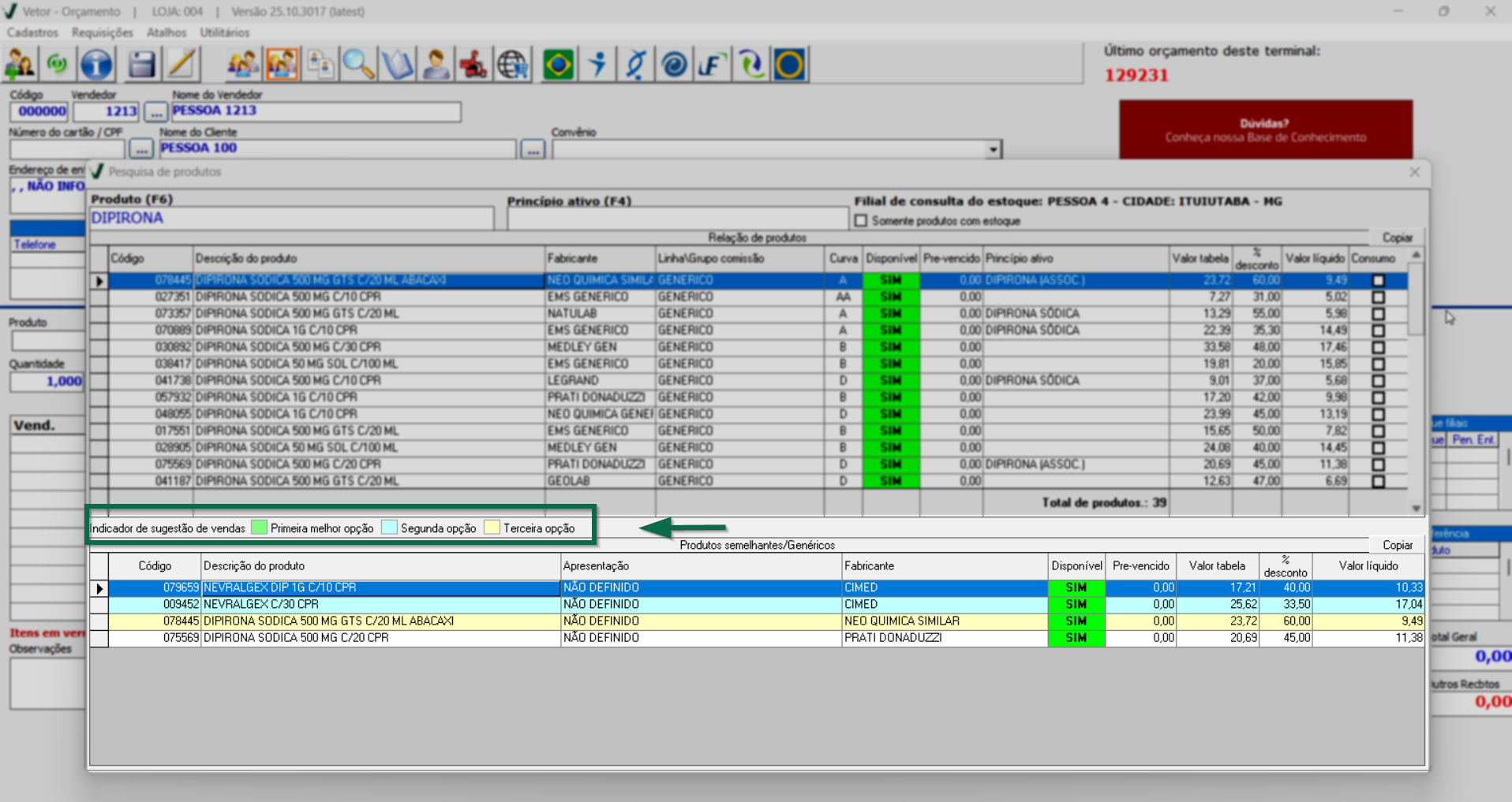 Perceba ainda que os produtos similares são destacados com cores específicas, de acordo com os níveis de rentabilidade definidos pelo sistema. Essa classificação por cores auxilia o balconista na escolha do item mais adequado, permitindo comparar entre opções mais ou menos rentáveis. Cada cor representa um "Indicador de sugestão de venda", diferenciando os itens visualmente entre as opções de escolha: verde primeira melhor opção, azul segunda melhor opção e amarelo terceira melhor opção, conforme os critérios de rentabilidade configurados no sistema.