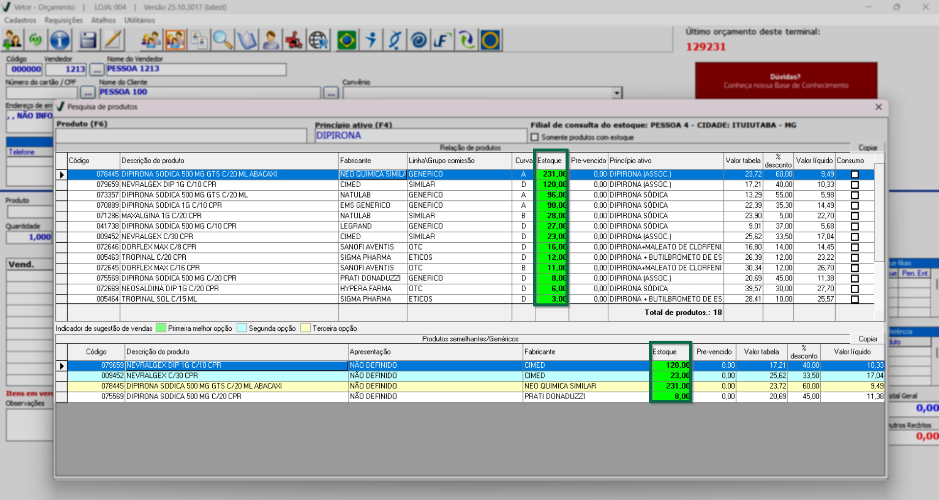 A exibição do estoque pode variar conforme a configuração dos parâmetros por empresa mencionados. Eles influenciam as duas seções da tela de pesquisa, tanto na seção superior que lista os produtos encontrados na pesquisa, quanto na seção inferior, onde são exibidos produtos relacionados por princípio semelhantes/genéricos. Veja a seguir: