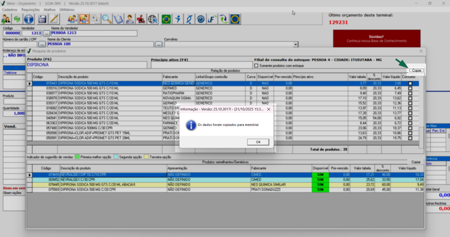Caso seja do interesse do operador copiar os dados dos produtos para um arquivo de texto ou Excel, basta clicar no botão "Copiar". Assim, o sistema fará a cópia das informações para a memória do computador, portanto, basta colar no documento desejado.