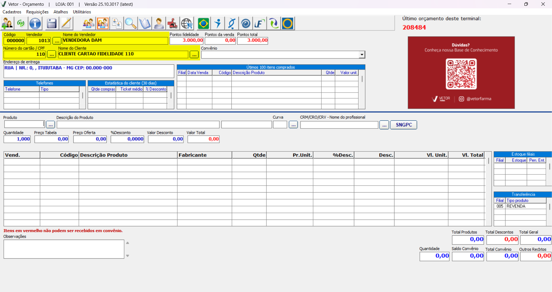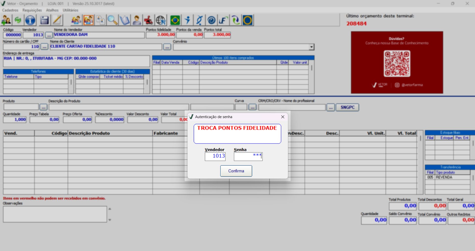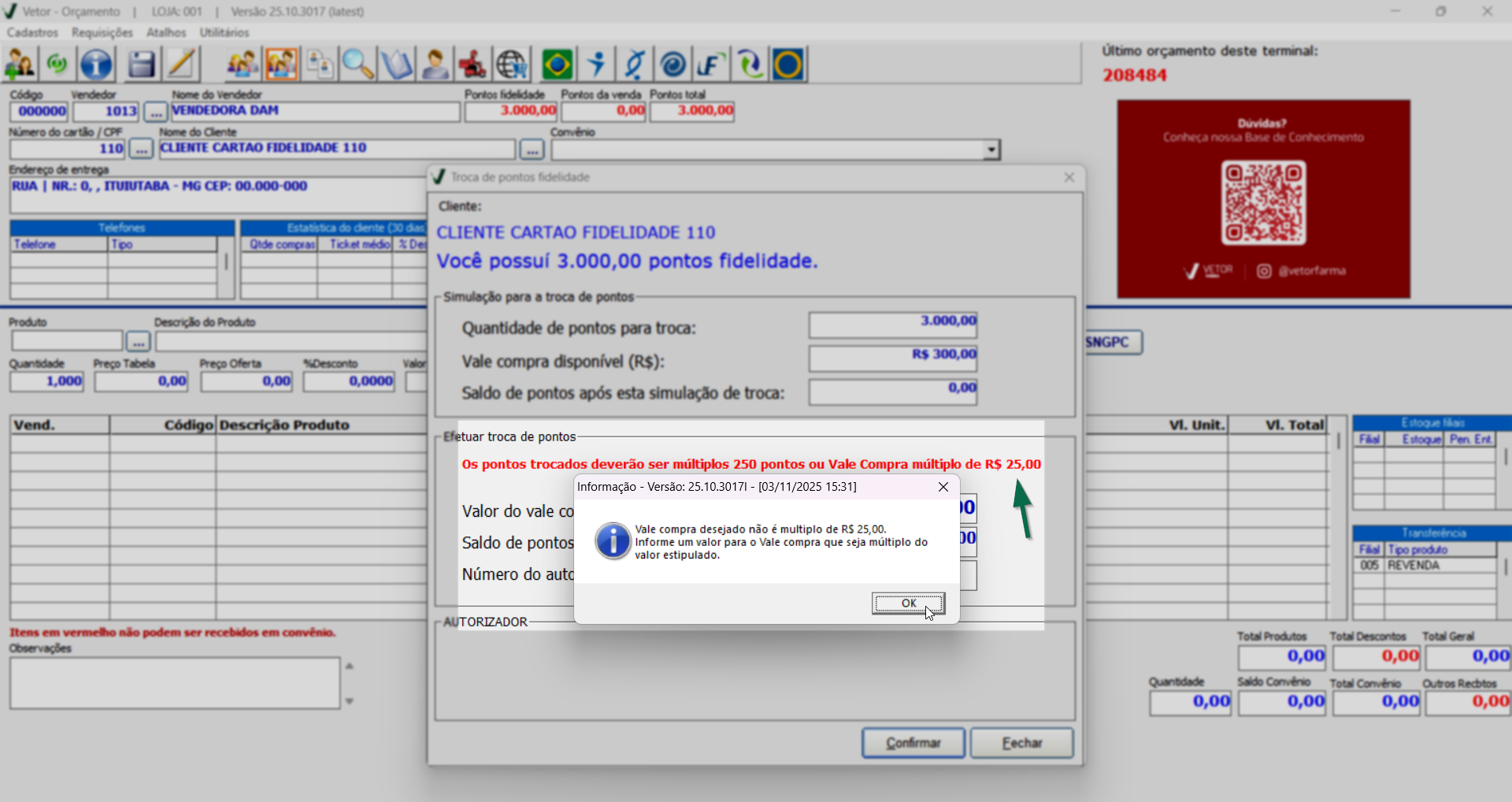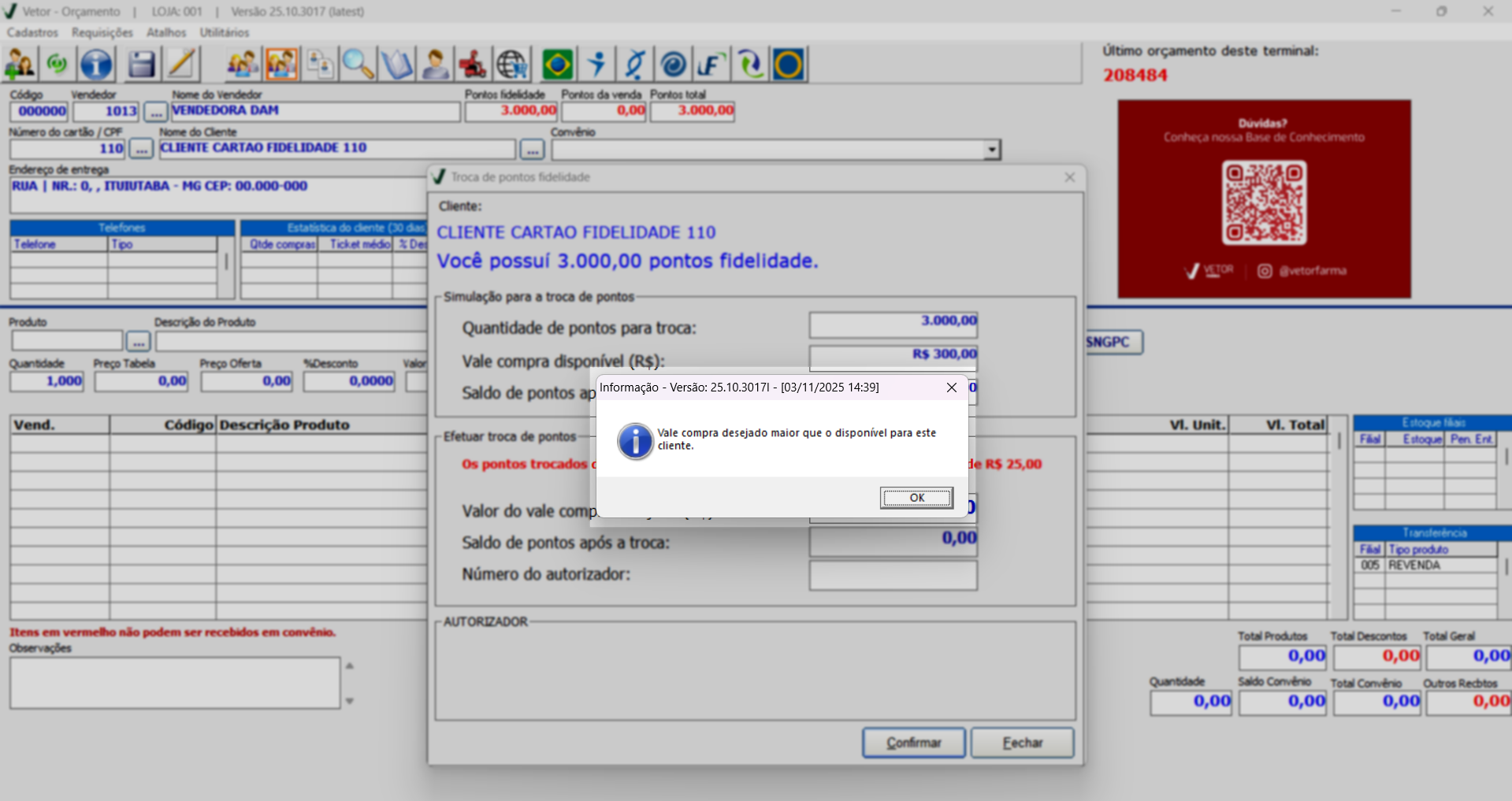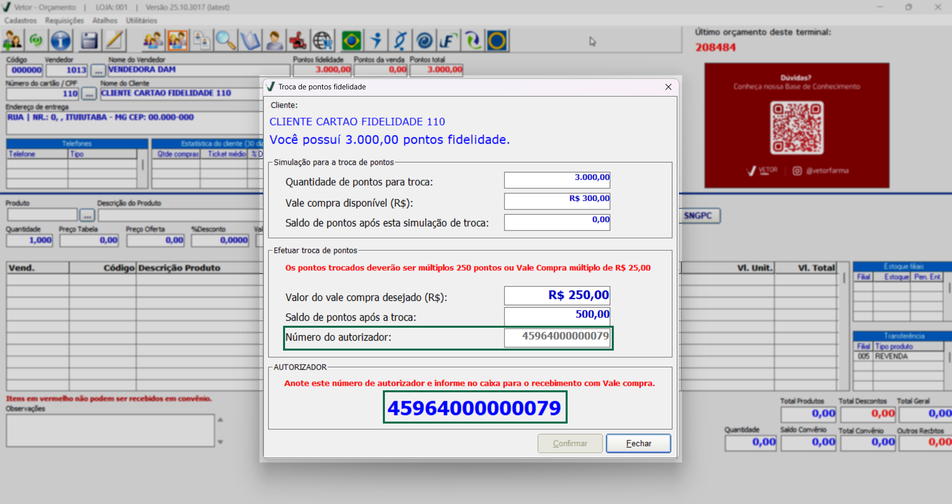 Caso a loja tenha realizado a importação de clientes de outro sistema para o Vetor Farma, pode ocorrer de cadastros irem incompletos, neste caso, se ao acionar a opção mencionada, o sistema exibir a seguinte mensagem "Cliente com número fidelidade inválido. Código: ...", significa que o cliente em questão não possui um número de fidelidade válido no sistema Vetor, sendo necessário que revise os dados cadastrais dele. Clique aqui para saber mais sobre essa operação.