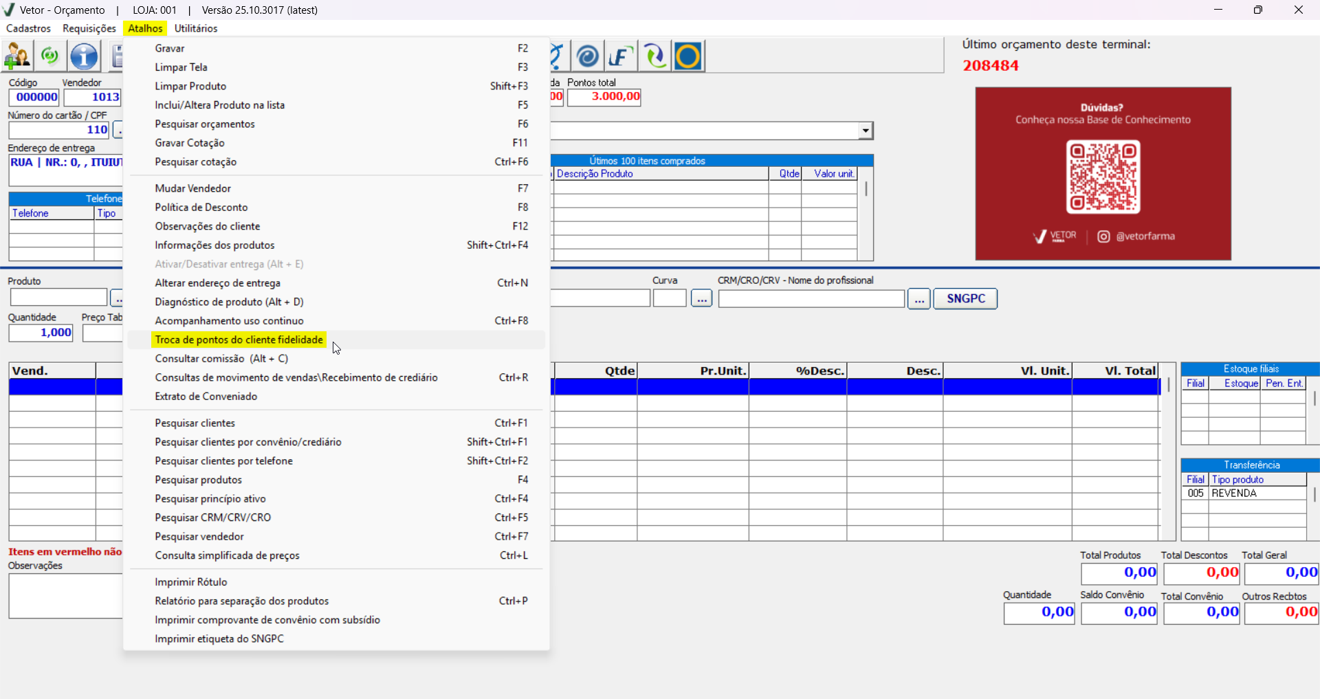 Em seguida, clique no menu "Atalhos" e selecione a opção "Troca de pontos do cliente fidelidade".