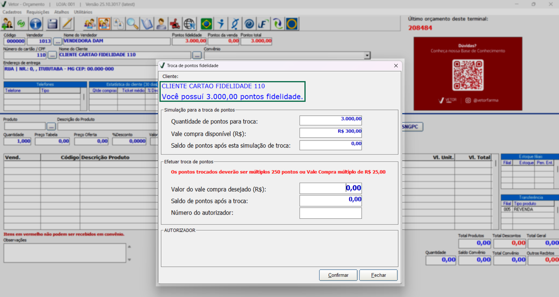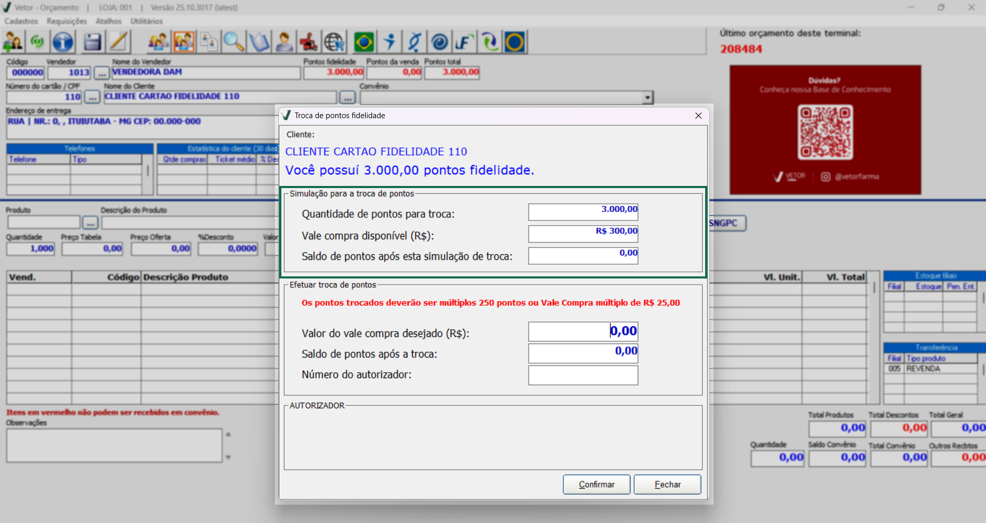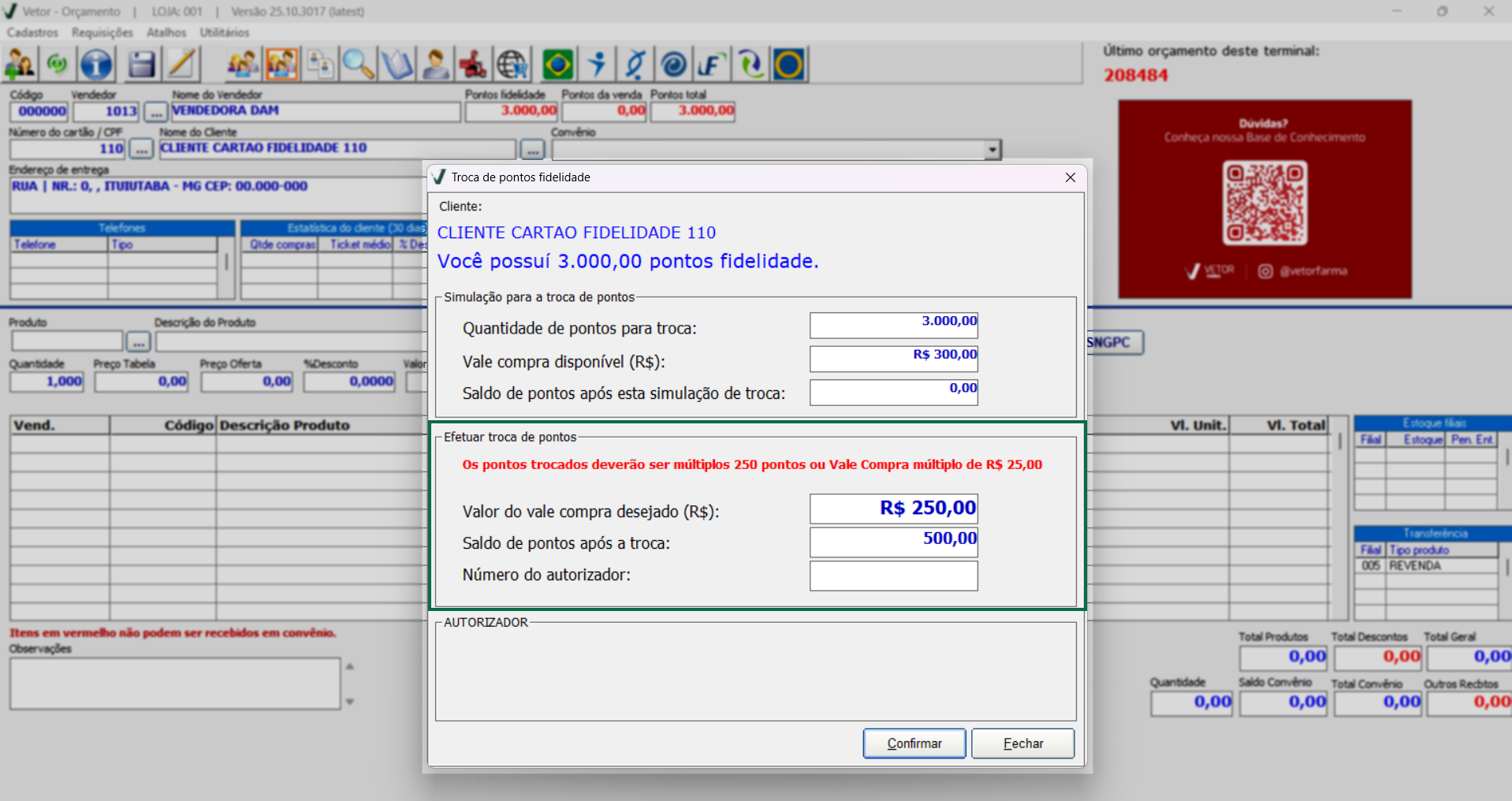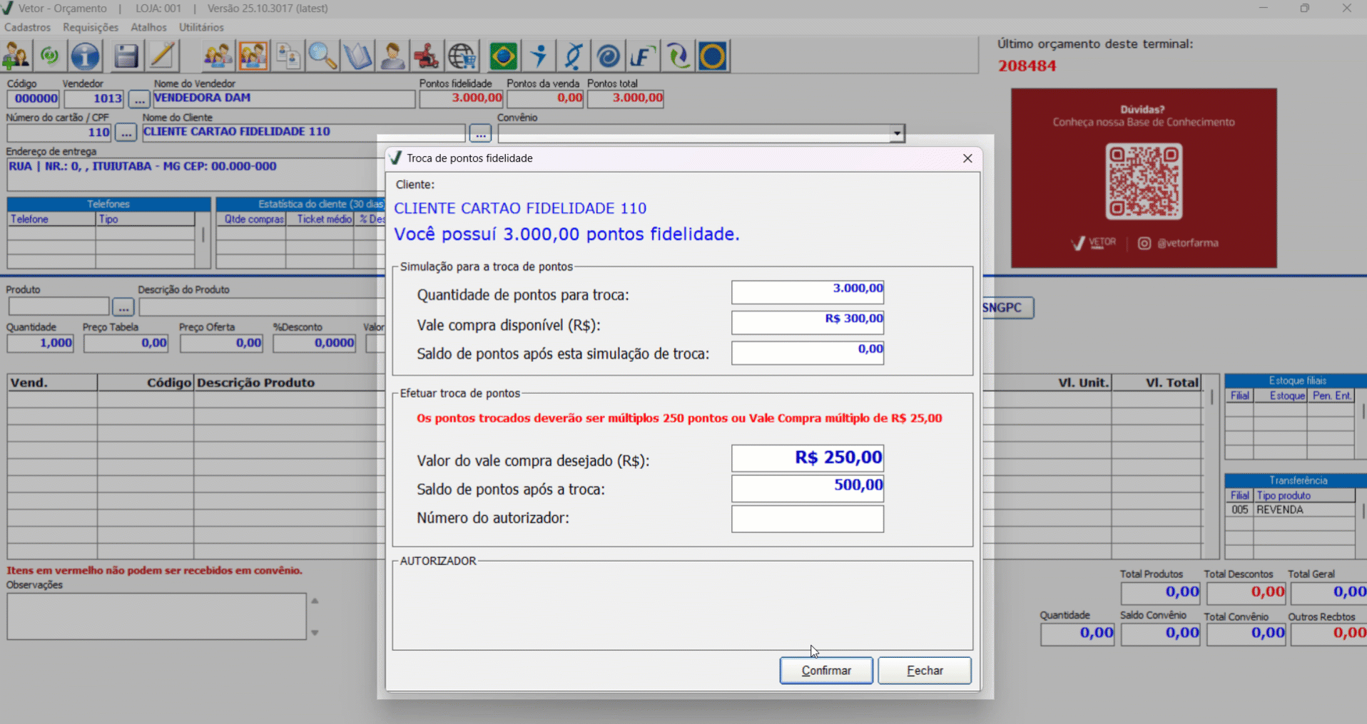 Após concluir a troca de pontos e fechar a tela, o sistema exibirá a mensagem: “Deseja vincular o vale-compra gerado ao orçamento em andamento?”. Ao clicar em >> Sim, caso o operador finalize um orçamento para o cliente, o vale-compra será vinculado automaticamente a esse orçamento. Assim, ao concluir a venda no PDV, o número de autorização referente à troca de pontos será associado automaticamente à transação, dispensando a necessidade de informar o código autorizador manualmente. Se o usuário optar por >> Não, o vale-compra permanecerá disponível para utilização em outro orçamento, não necessariamente o próximo a ser finalizado. Clique aqui para aprender a realizar um recebimento no PDV utilizando os pontos para troca.