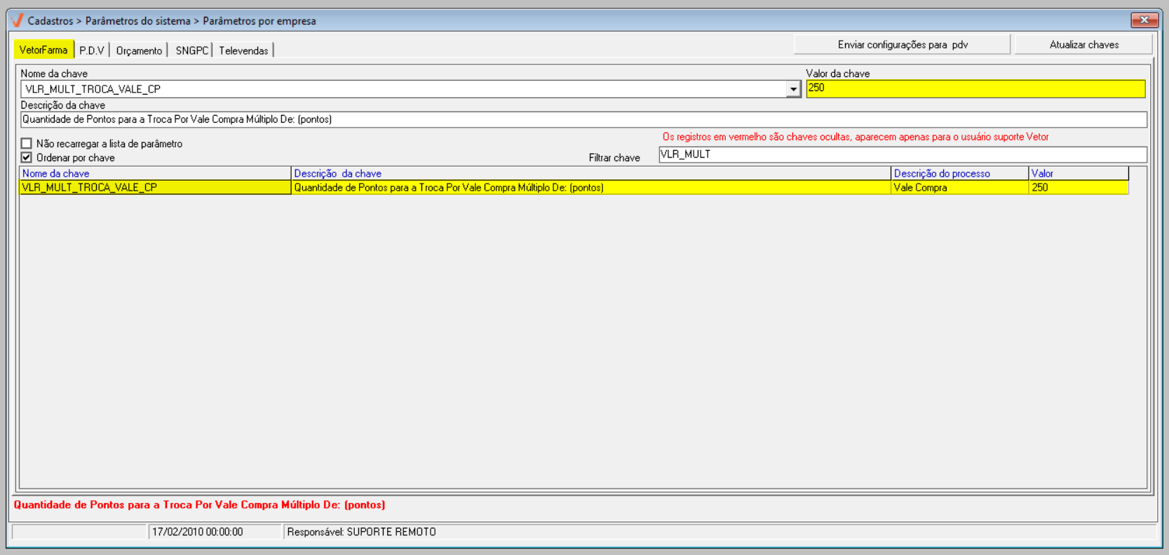 - Para esta operação, o usuário pode configurar a quantidade de pontos necessária para a troca por vale-compra, definindo valores em múltiplos por meio do parâmetro por empresa VLR_MULT_TROCA_VALE_CP no módulo VetorFarma. Isso significa que o valor do vale-compra ou a quantidade de pontos informada para a troca deve ser divisível pelo valor configurado. Caso contrário, o sistema não permitirá a operação. Clique aqui para acessar a documentação da tela "Parâmetros por empresa". A configuração é realizada na aba "VetorFarma", onde o usuário deve localizar a chave mencionada e informar, no campo "Valor da chave", o valor desejado.