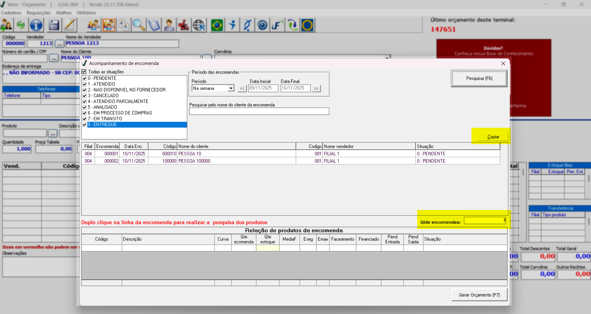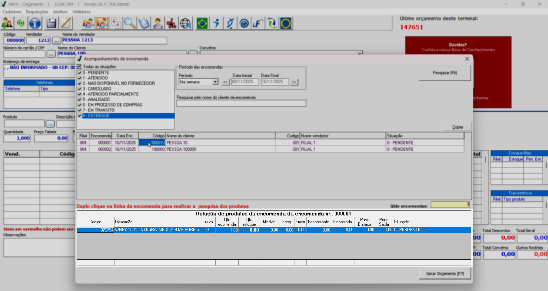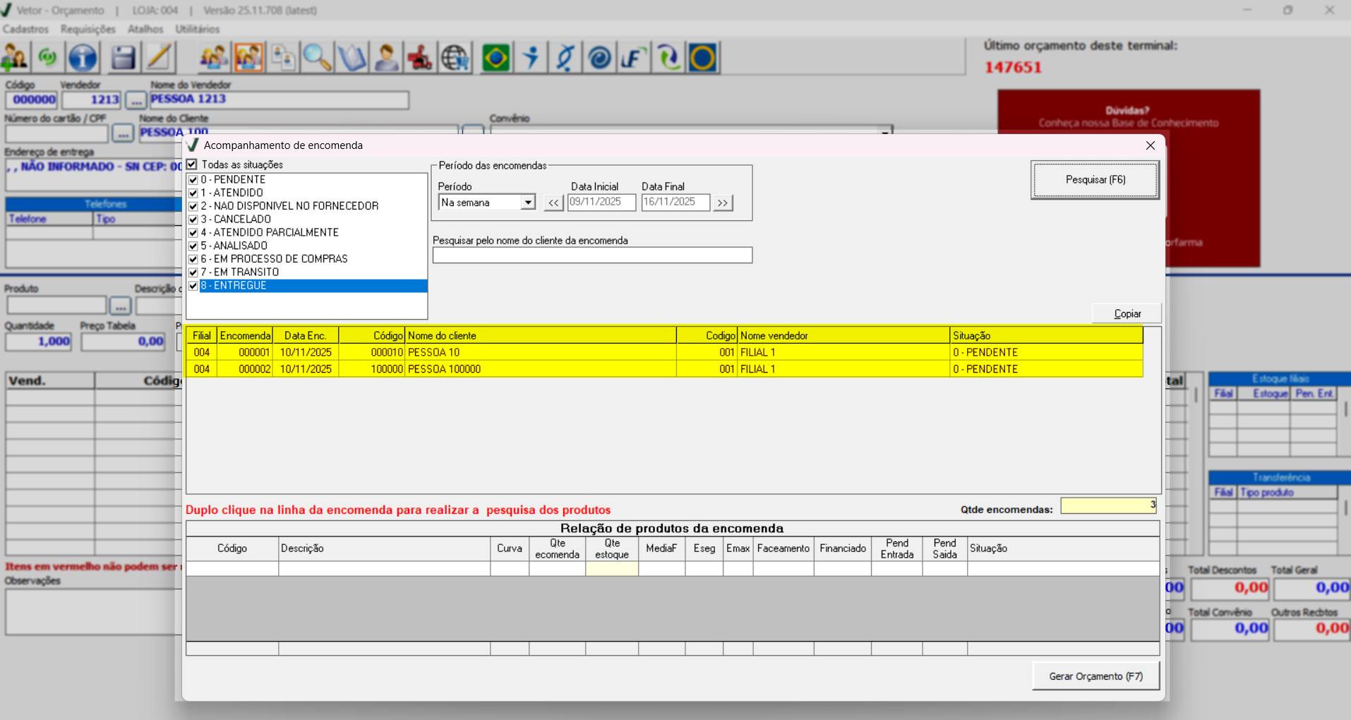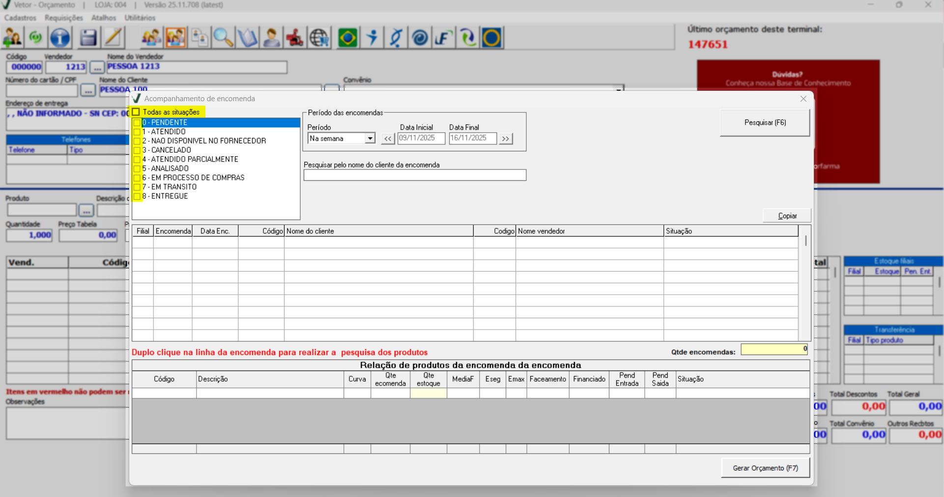 - 0-Pendente: Indica encomendas que ainda não foram atendidas, ou seja, aguardam retorno dos fornecedores quanto à disponibilidade dos produtos solicitados.
