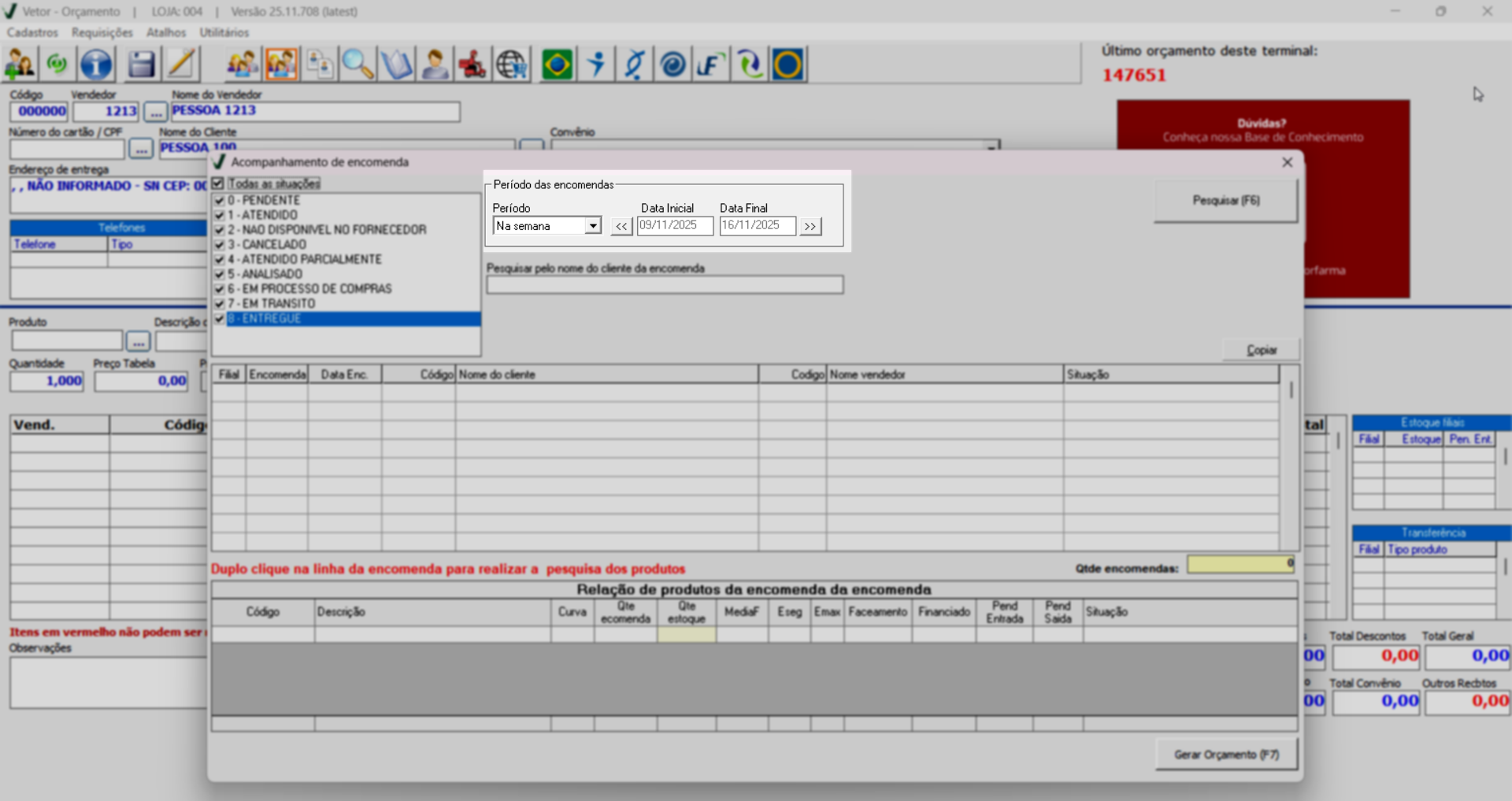 - 8-Entregue: Refere-se às encomendas que foram entregues aos o cliente. A encomenda se enquadra nesta situação quando o operador finaliza a venda para o cliente no módulo orçamento e indica a entrega total.