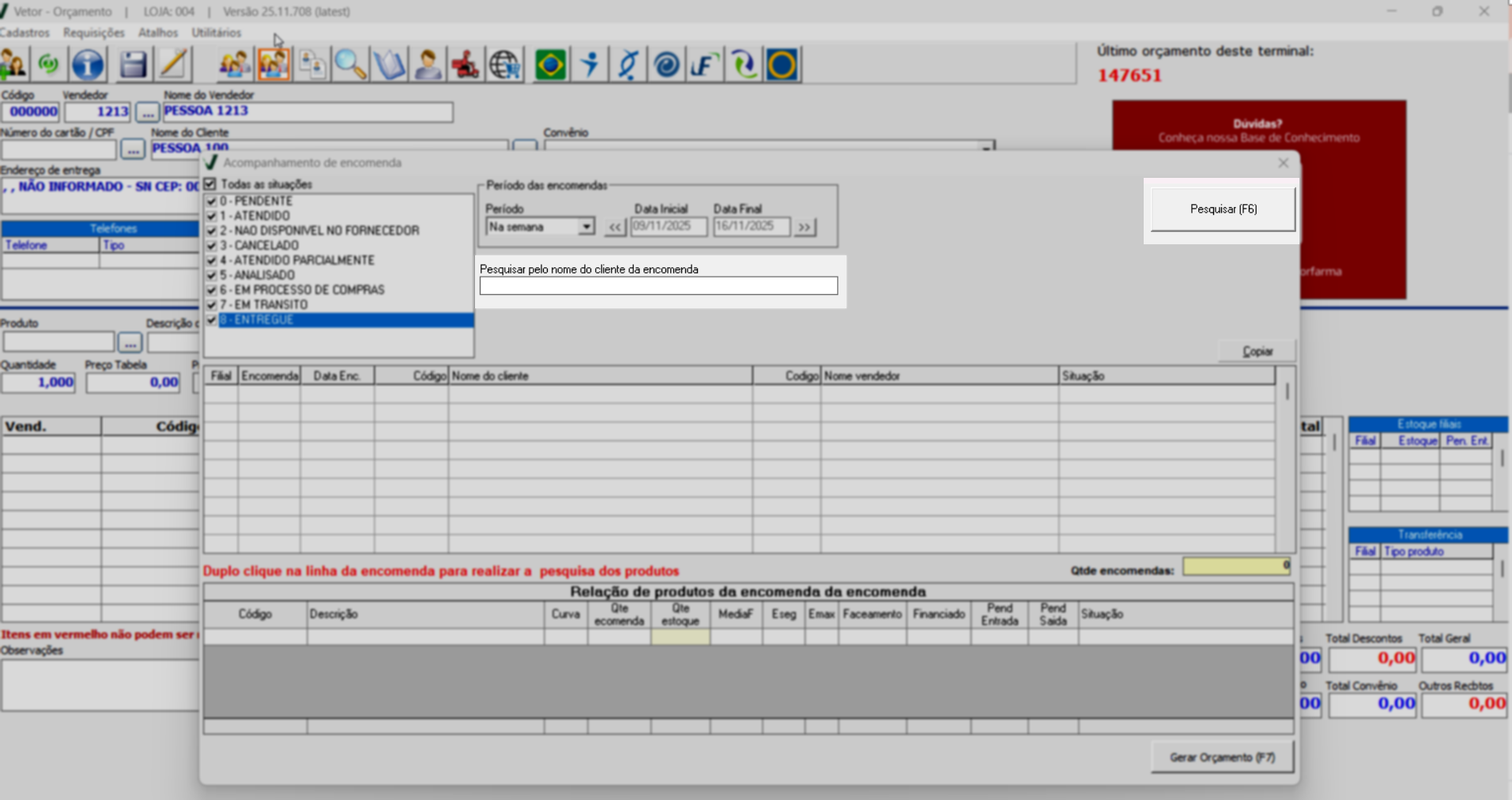 Para realizar a busca, o usuário pode localizar as encomendas de um cliente específico informando seu nome no campo “Pesquisar pelo nome do cliente da encomenda”. Caso deseje consultar todas as encomendas do período de referência, basta deixar esse campo em branco e acionar o atalho F6 ou o botão >> Pesquisar (F6) para executar a busca.