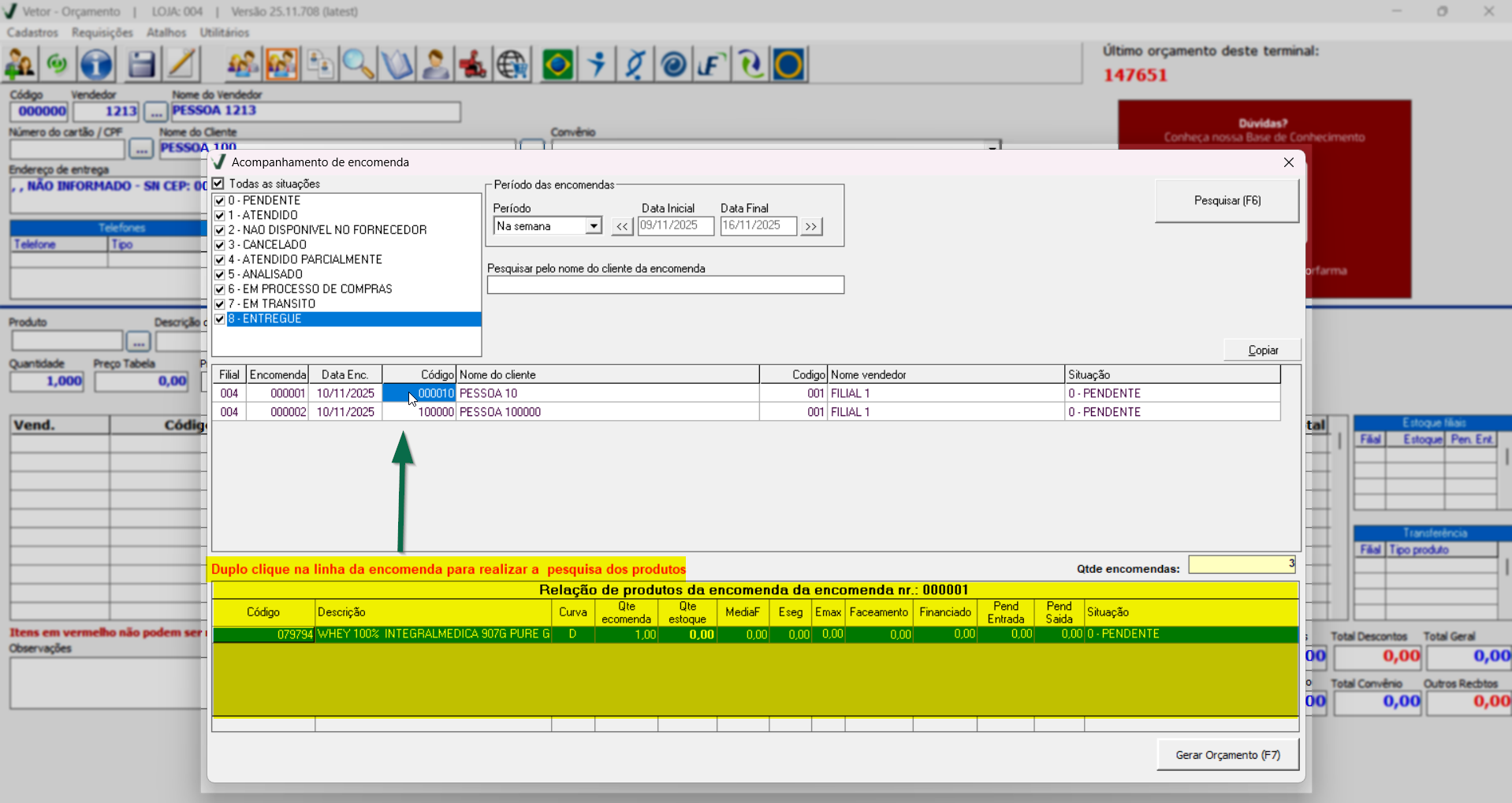 Na parte inferior da tela, é exibida a orientação: "Duplo clique na linha da encomenda para realizar a pesquisa dos produtos". Conforme instruído, ao efetuar o duplo clique, os produtos serão listados na seção "Relação de produtos da encomenda".