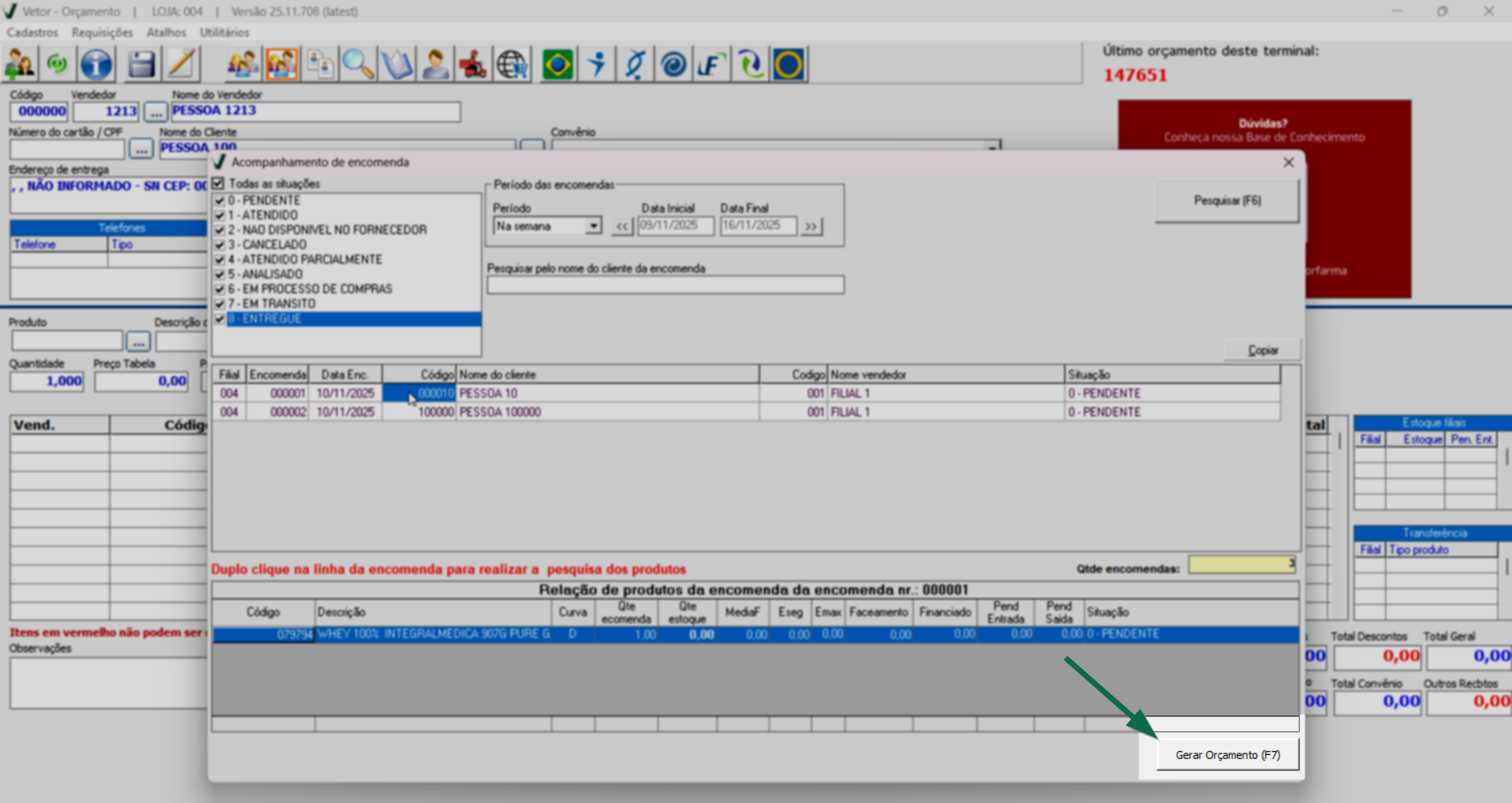 Para aquelas encomendas pendentes, atendidas parcialmente ou totalmente, será possível gerar o orçamento para o cliente. Para isso, basta clicar sobre o botão >> Gerar Orçamento (F7) ou utilizar o atalho F7.