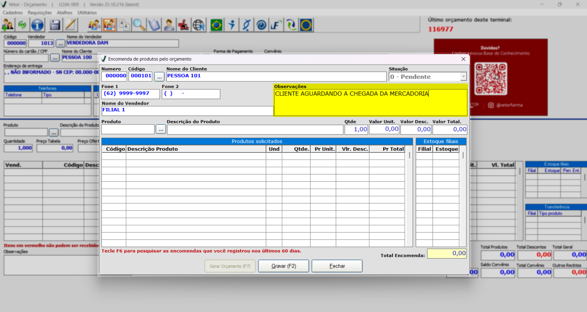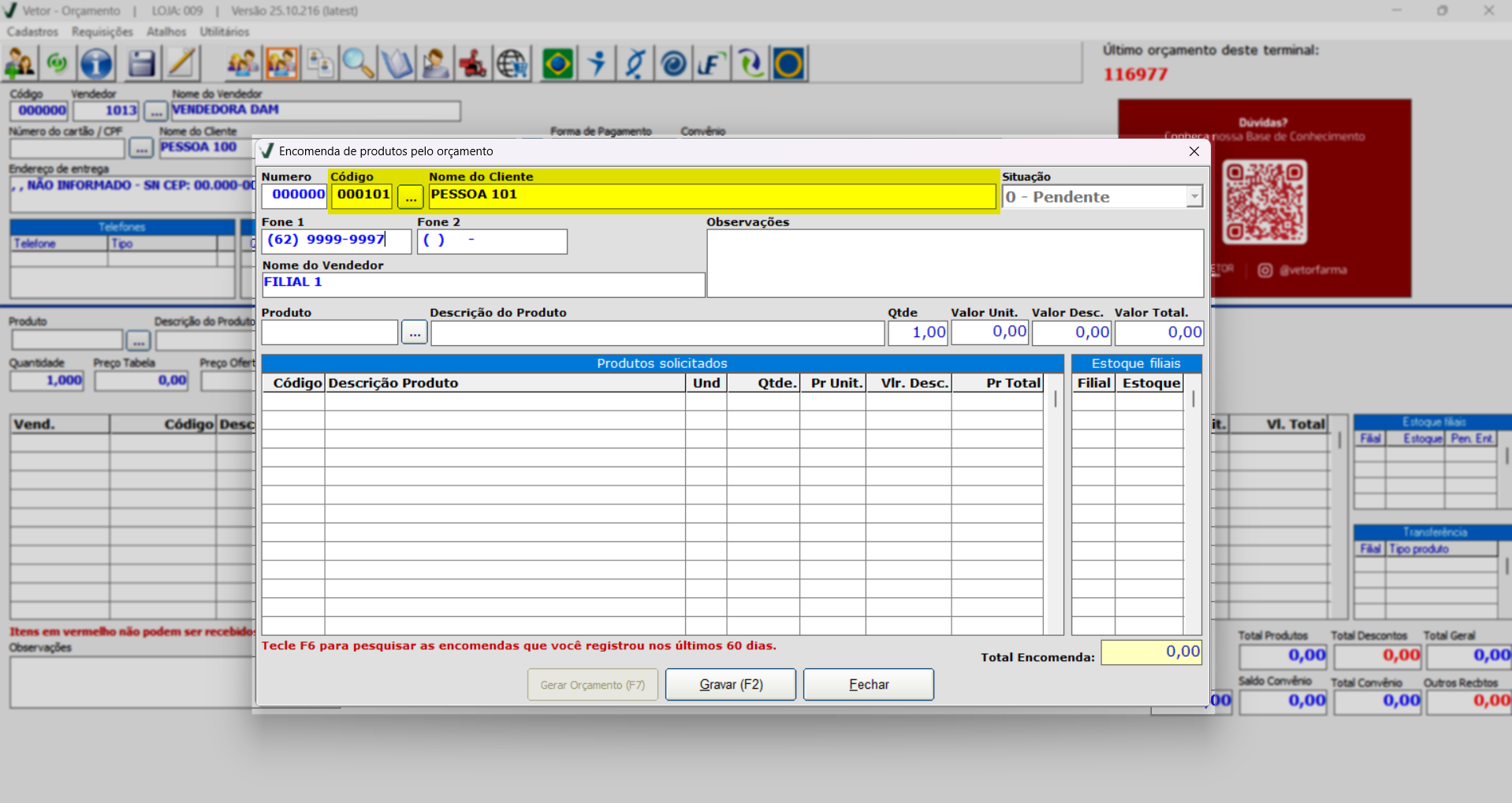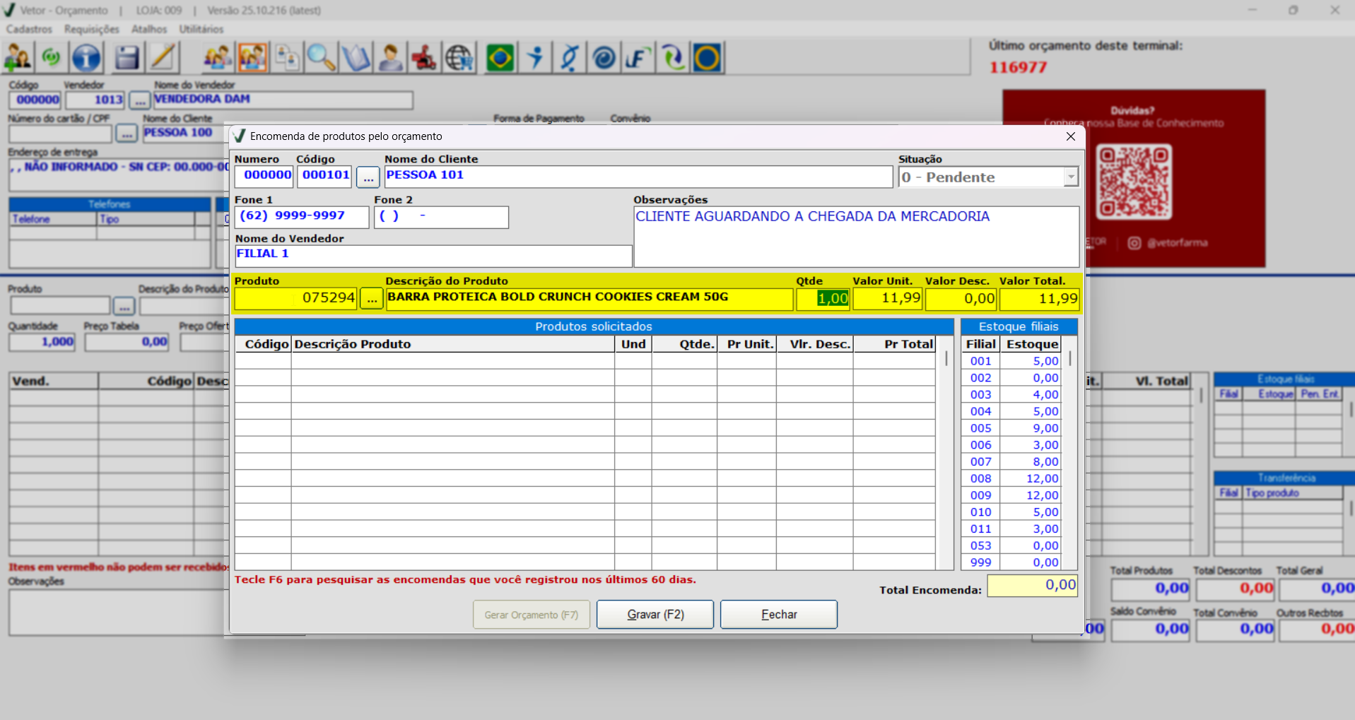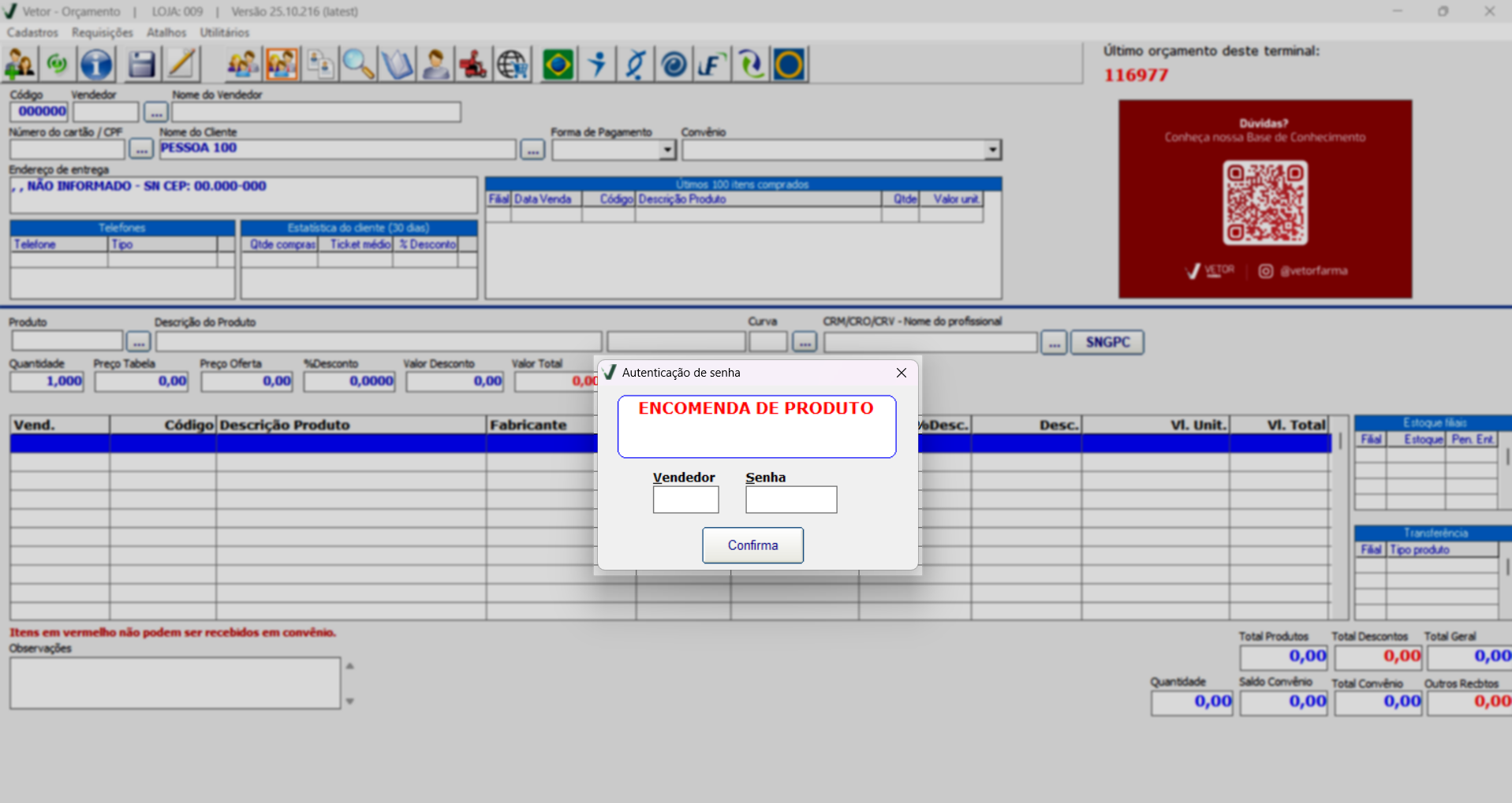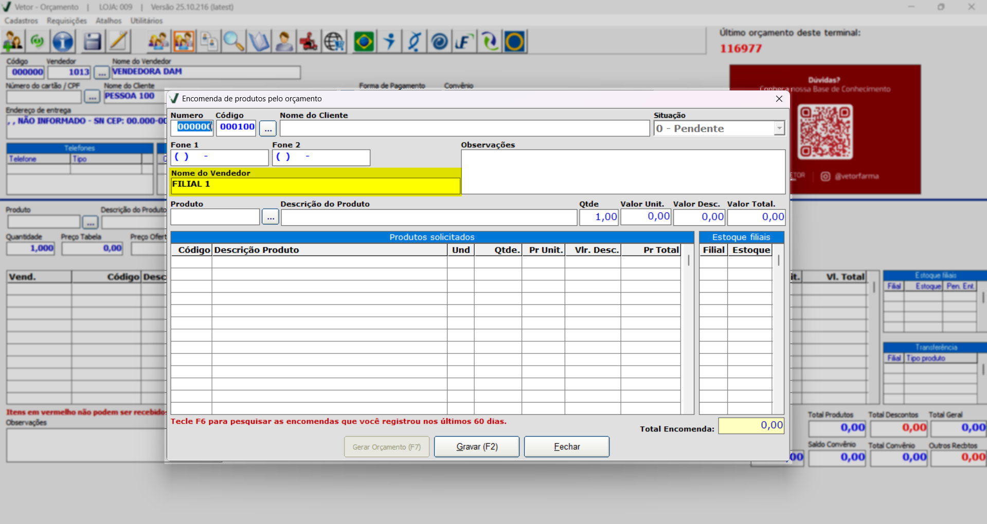 Uma encomenda é gerada quando o cliente solicita a compra de um produto que não está disponível em estoque na loja. Para atender essa demanda, o Módulo Orçamento permite que o balconista registre a encomenda no ato da venda, garantindo que a solicitação do cliente seja formalizada de forma prática e rápida. Esse registro pode ser visualizado na módulo "Compras" do Vetor Farma, permitindo que o comprador da loja seja informado sobre a falta do produto e, assim, possa realizar a aquisição do item posteriormente.