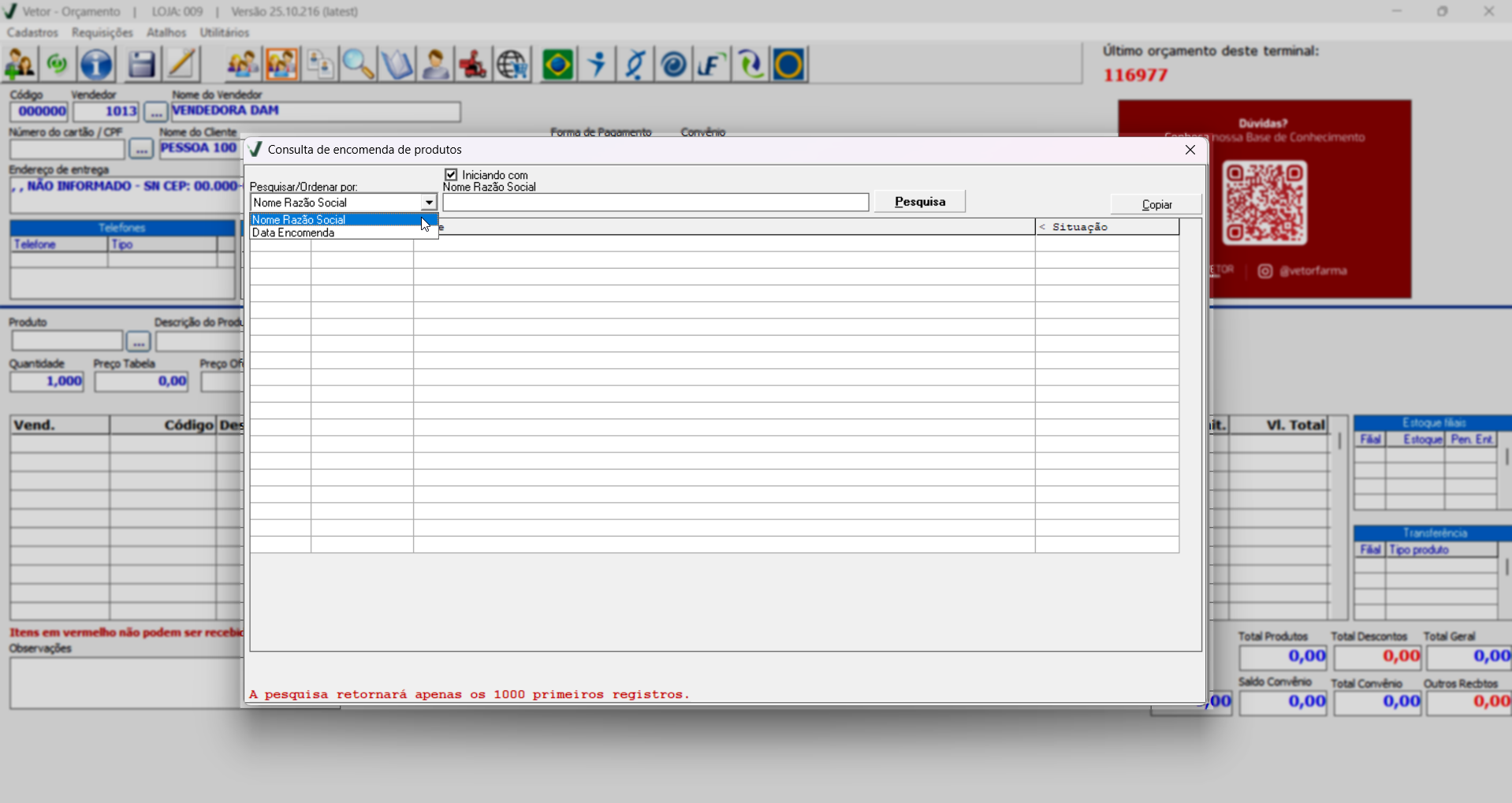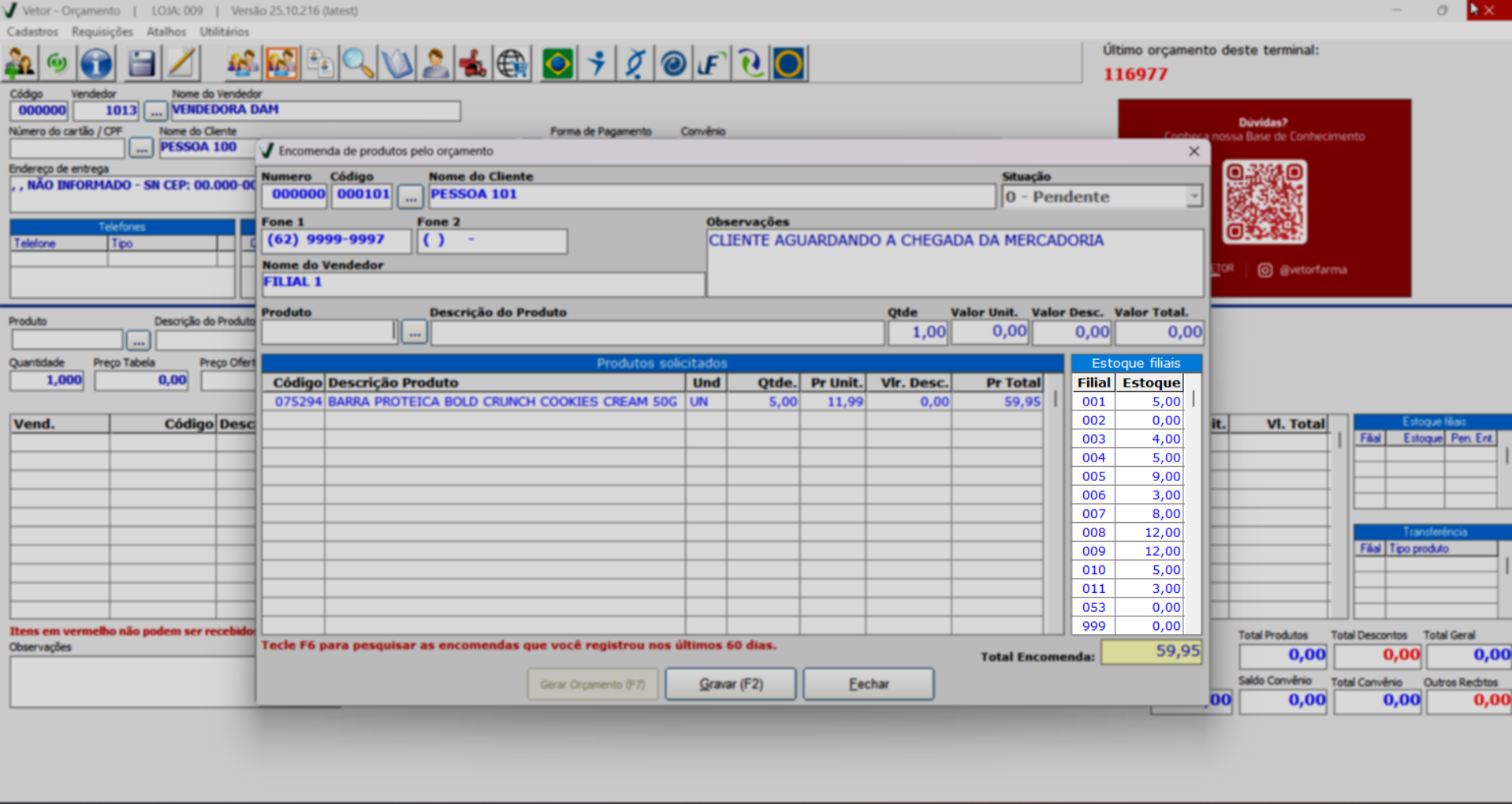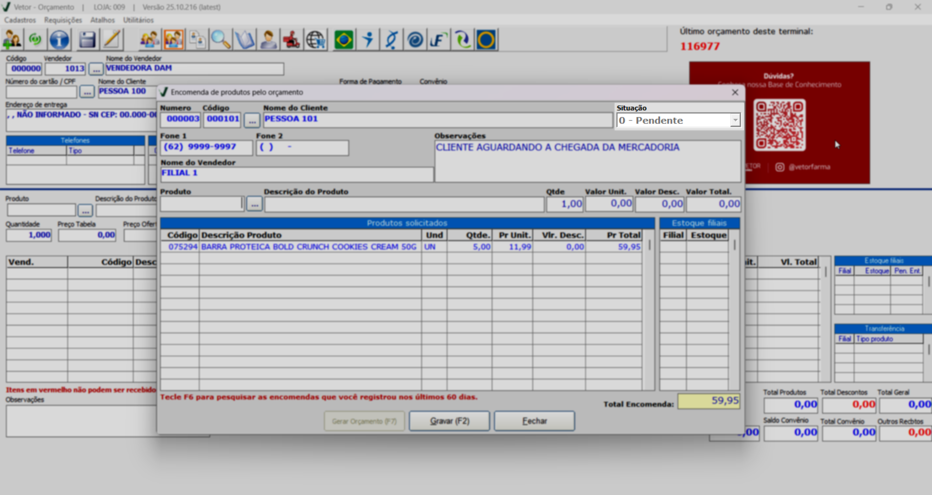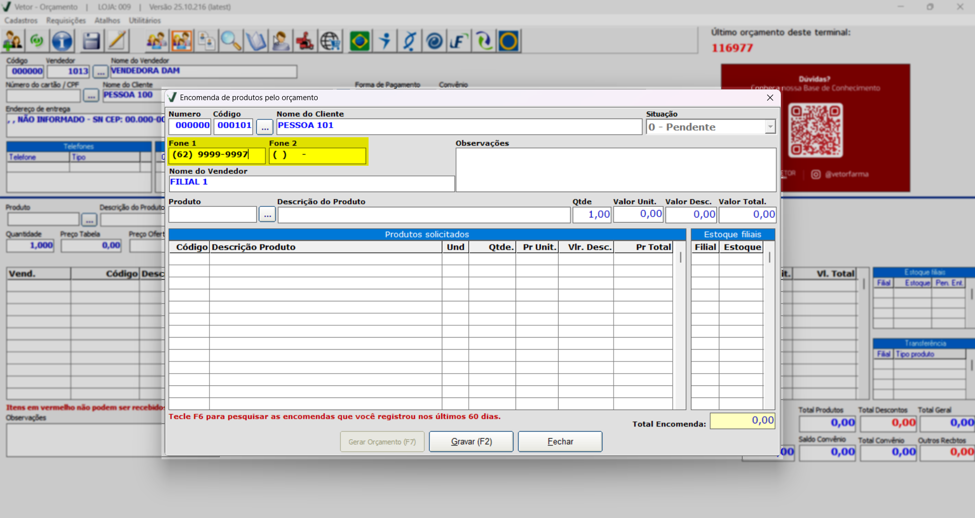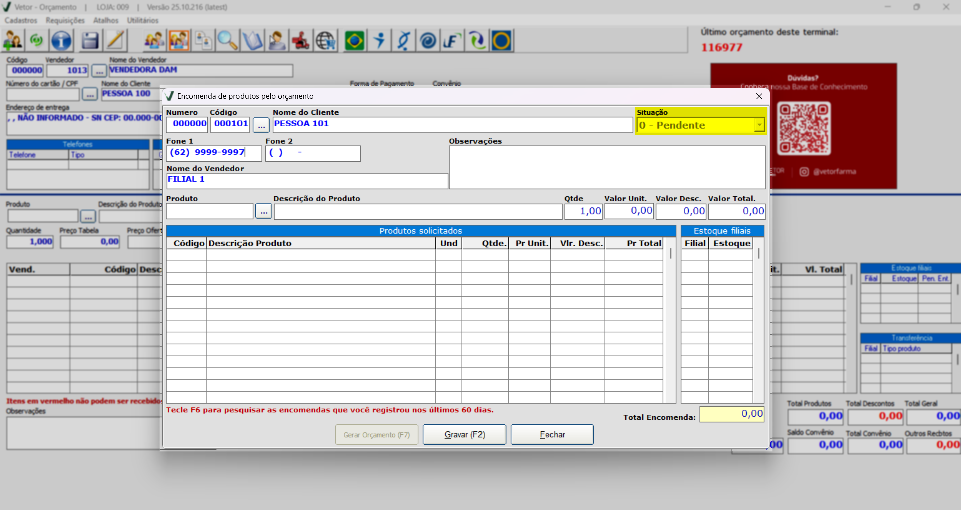 Uma encomenda é gerada quando o cliente solicita a compra de um produto que não está disponível em estoque na loja. Para atender essa demanda, o Módulo Orçamento permite que o balconista registre a encomenda no ato da venda, garantindo que a solicitação do cliente seja formalizada de forma prática e rápida. Esse registro pode ser visualizado na módulo "Compras" do Vetor Farma, permitindo que o comprador da loja seja informado sobre a falta do produto e, assim, possa realizar a aquisição do item posteriormente.