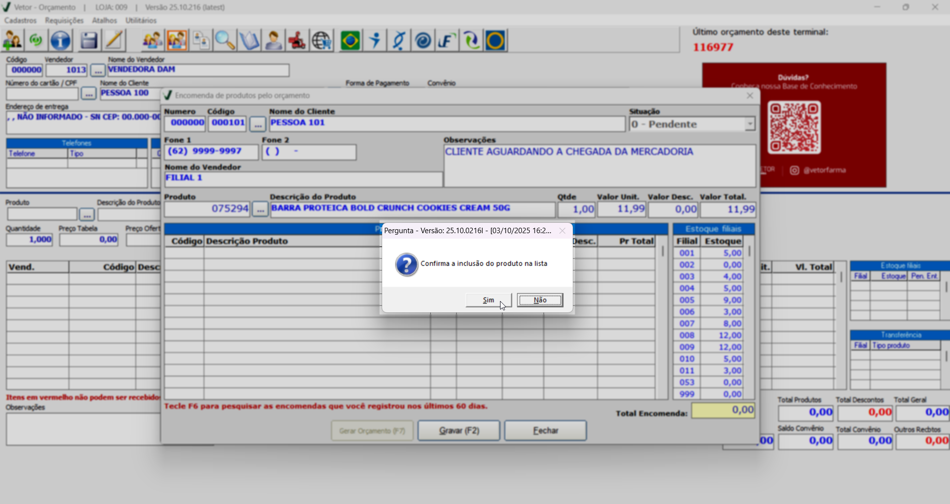 Clique em >> Sim para adicionar o produto na lista de produtos. Observe que no rodapé da tela, é informado o valor total da encomenda.