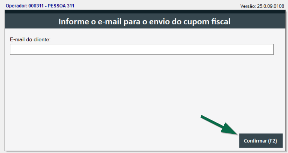 Em seguida, será aberta uma nova tela. Informe o endereço no campo "E-mail do cliente" e, para concluir, pressione >> F2 ou clique em >> Confirmar (F2).