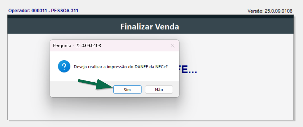 Se o parâmetro estiver configurado com a opção “0 – Imprime DANFE, comprovante de cartão e outros comprovantes”, o comprovante será impresso normalmente, pois essa opção imprime automaticamente todos os documentos. Nesse caso, será exibida a mensagem: "Deseja realizar a impressão do Danfe da NFC-e?" Clique em >> "Sim" para confirmar.