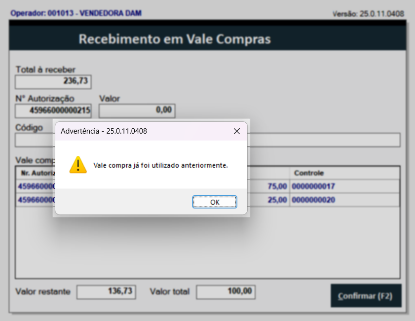 Não é permitido inserir um vale-compra já utilizado em outra venda. Caso o usuário realize uma tentativa, será exibido um alerta na tela: